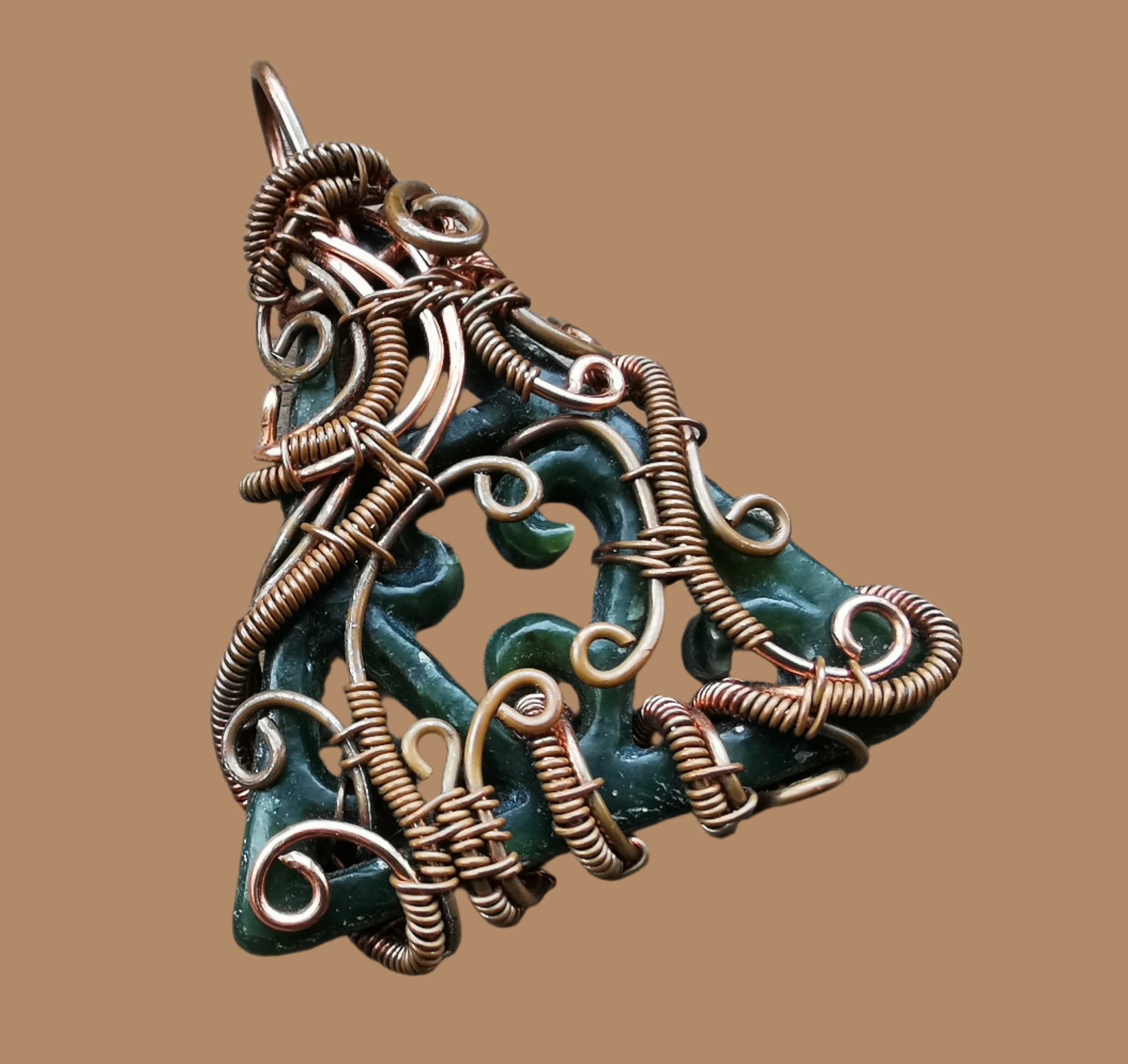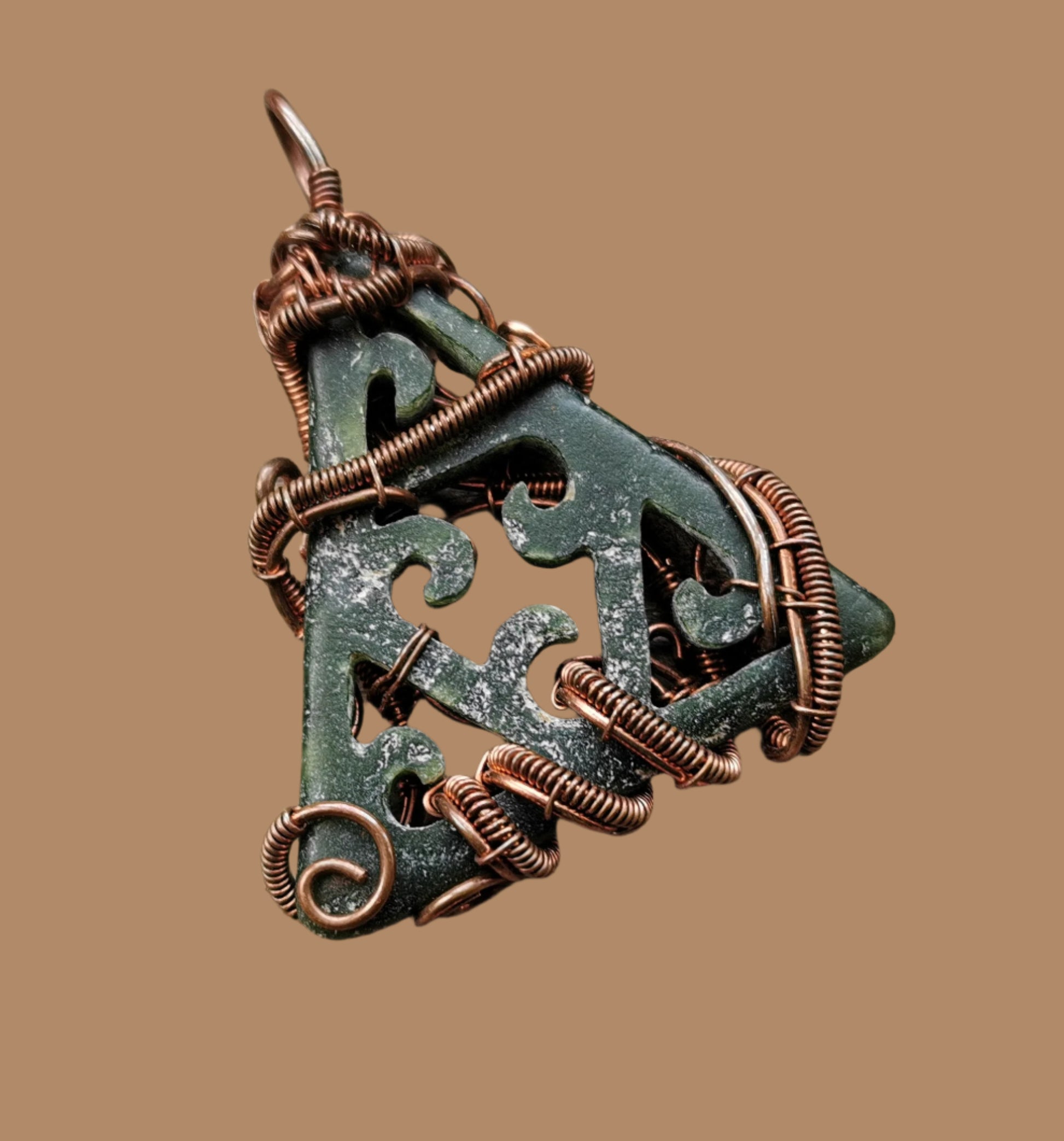 Ref.PD0818 - Wire wrap in copper with carved New Zealand jade gemstone.