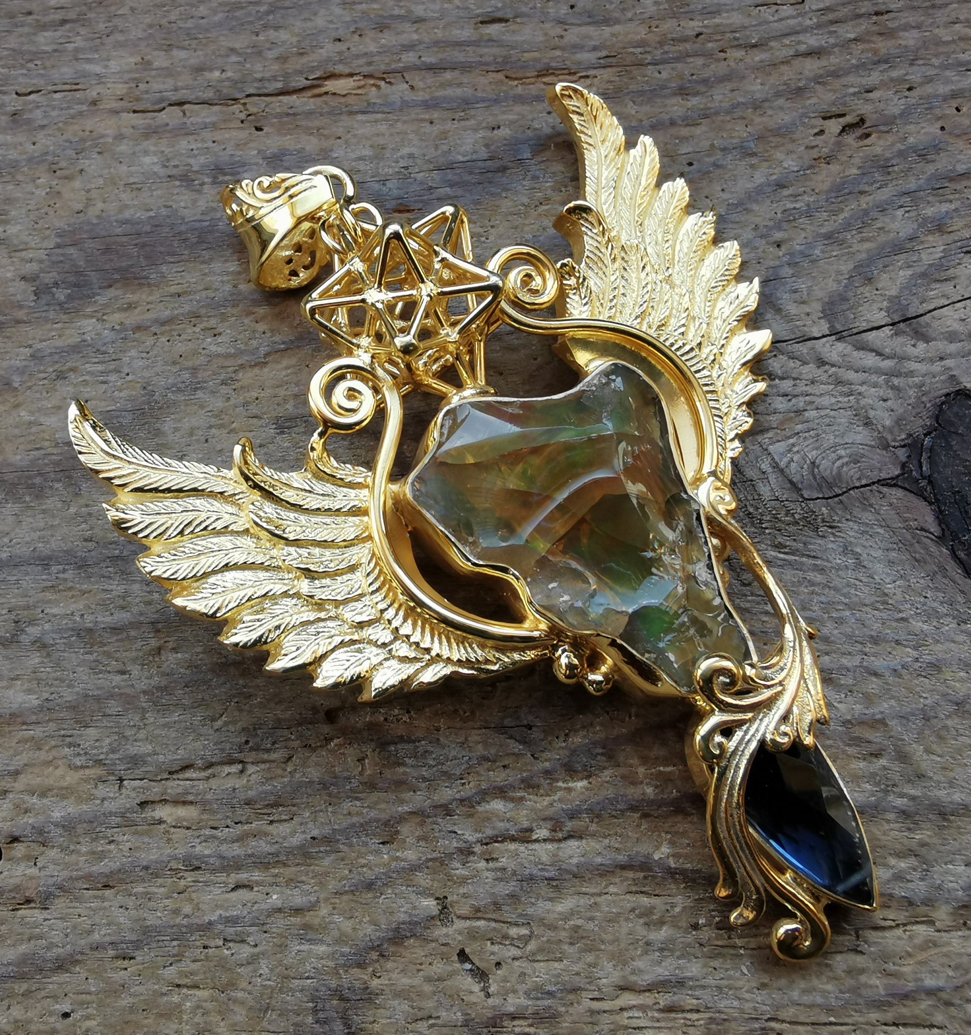 Ref.PD0819 - Gold plated on silver pendant with Solar Star geometry and wings, raw opal, and sapphire gemstones.