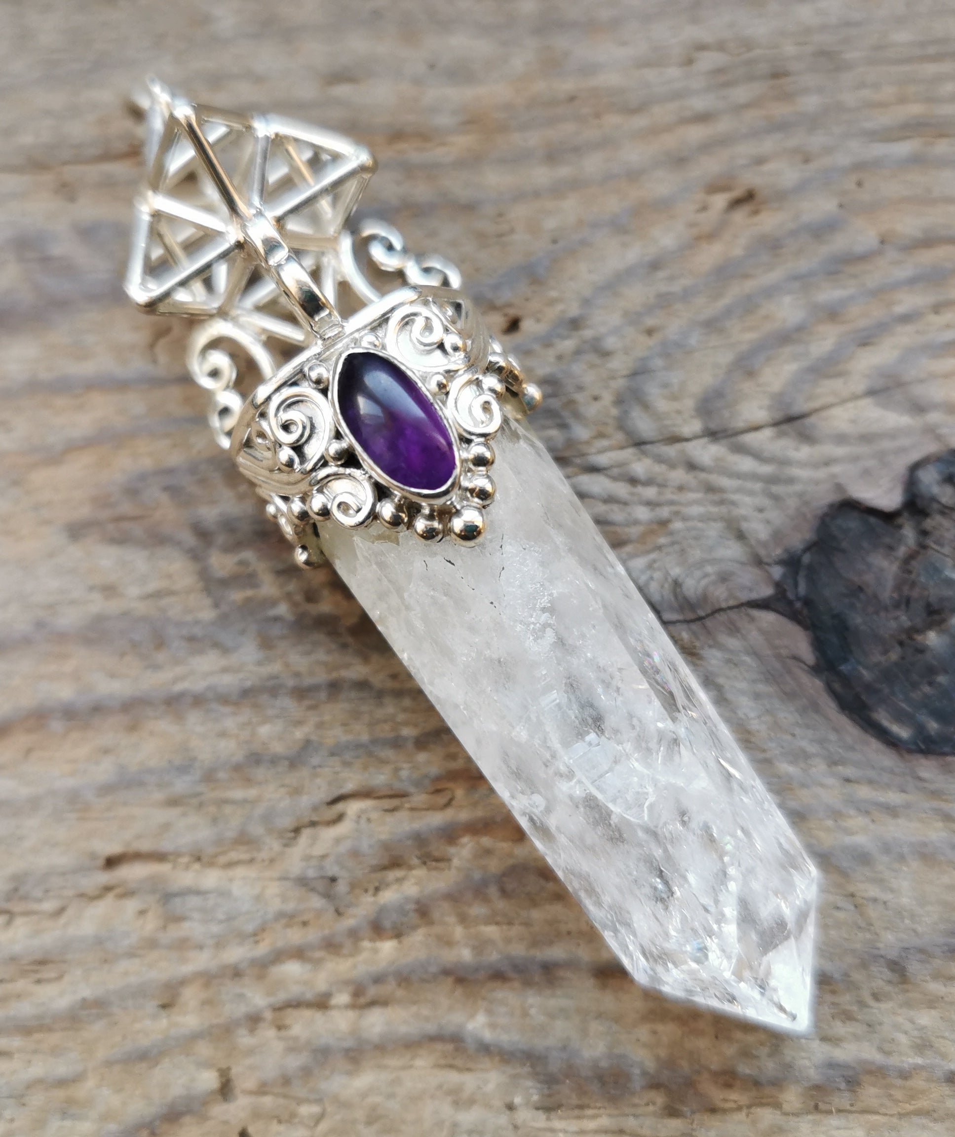 Ref.PD0822 - Silver pendant with Tantric Star geometry, Himalayan quartz crystal, and amethyst.