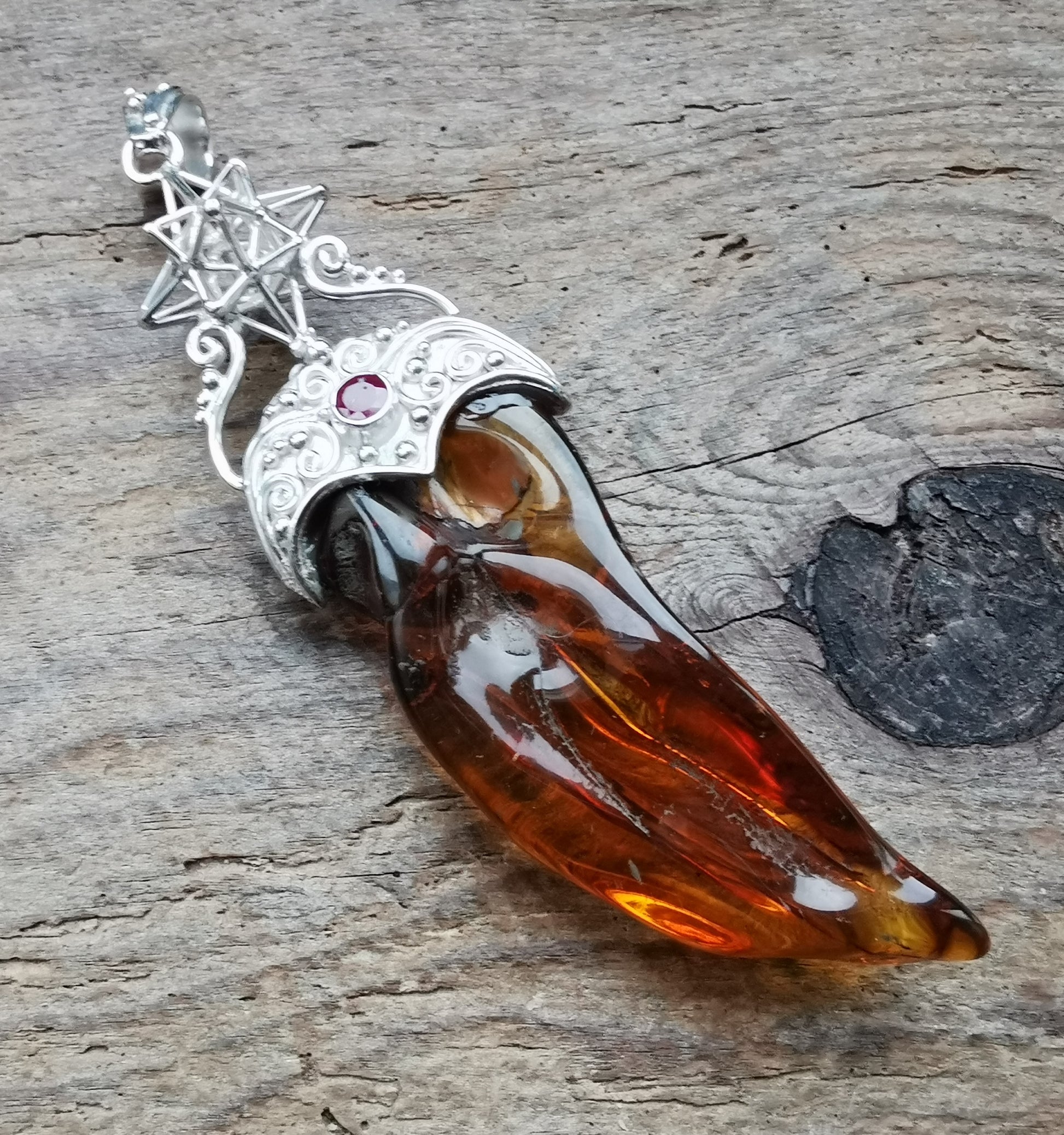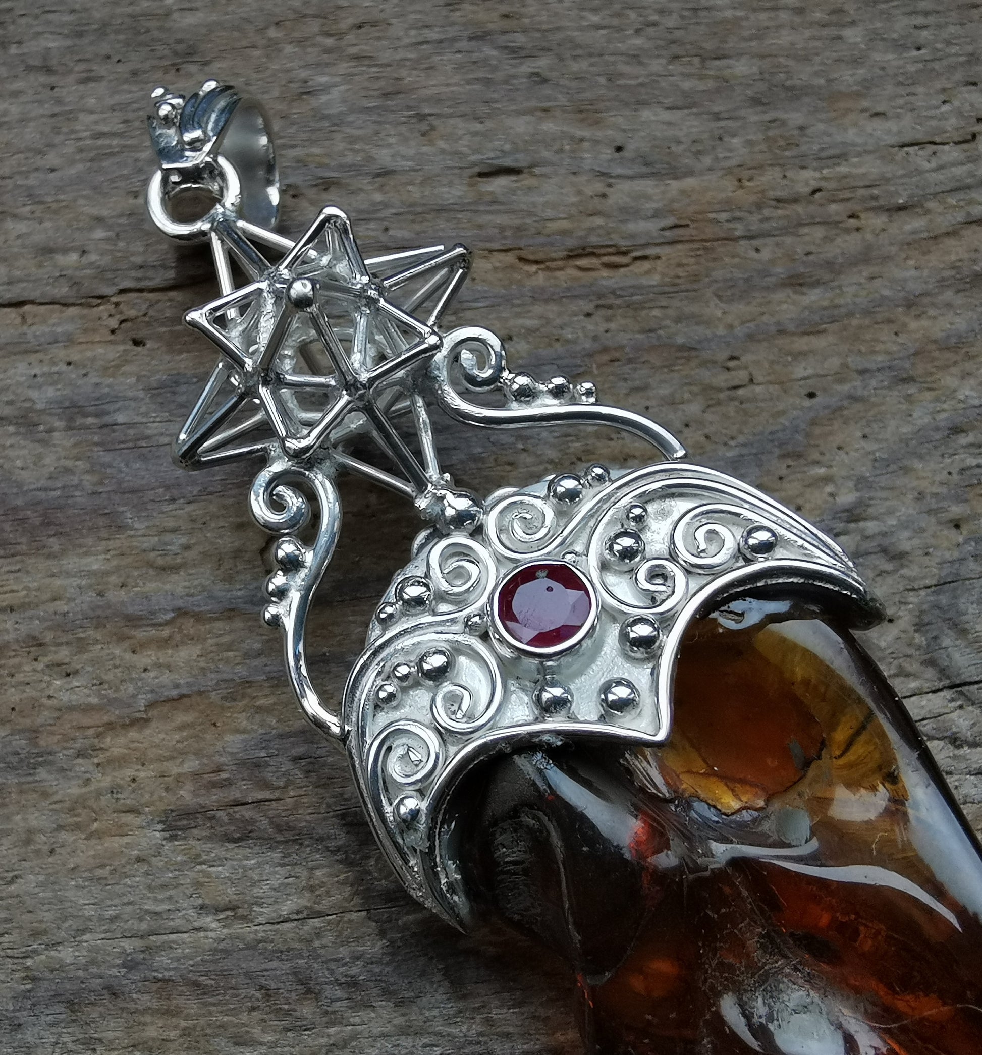 Ref.PD0824 - Silver pendant with Heart Star geometry, amber, and ruby gemstone.