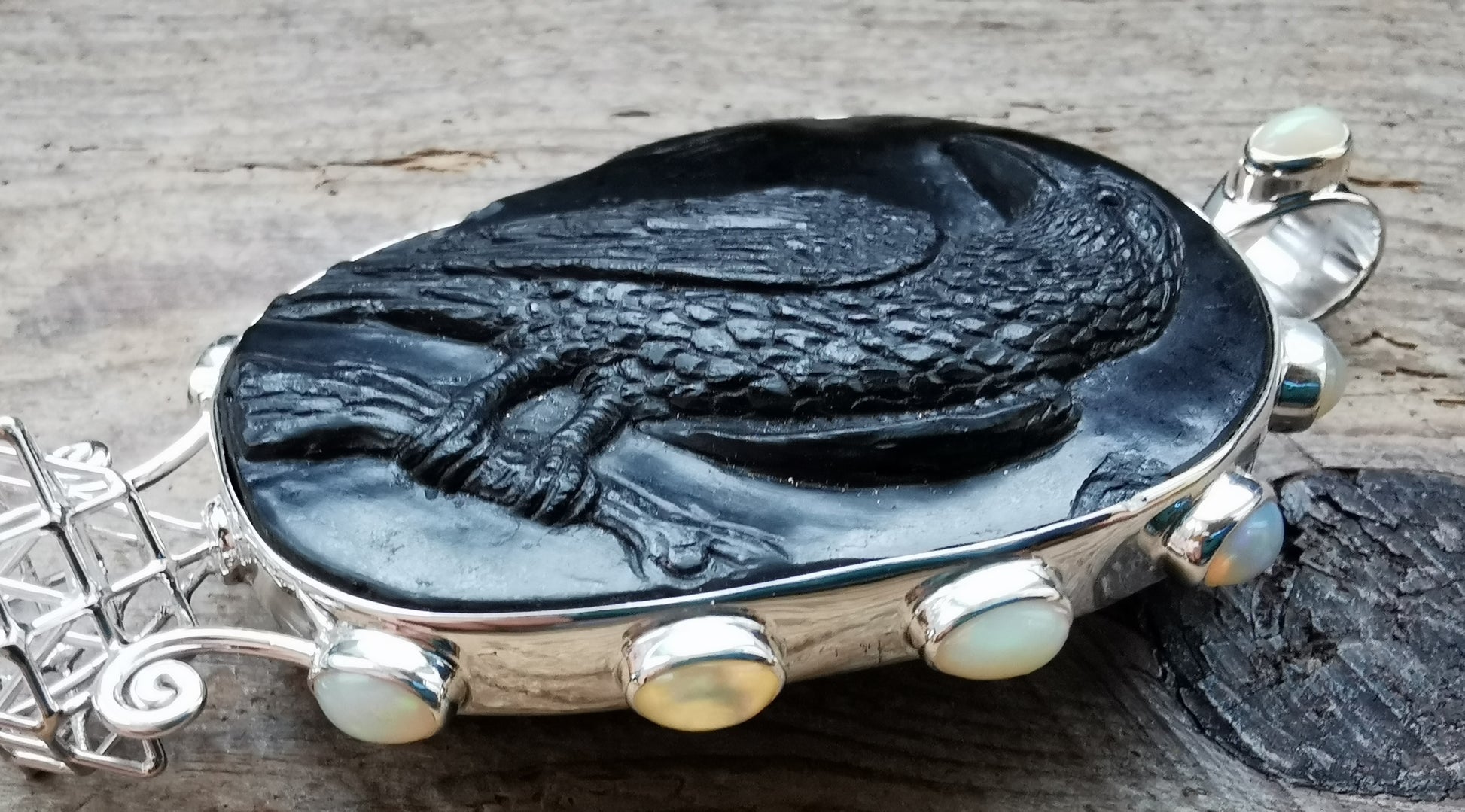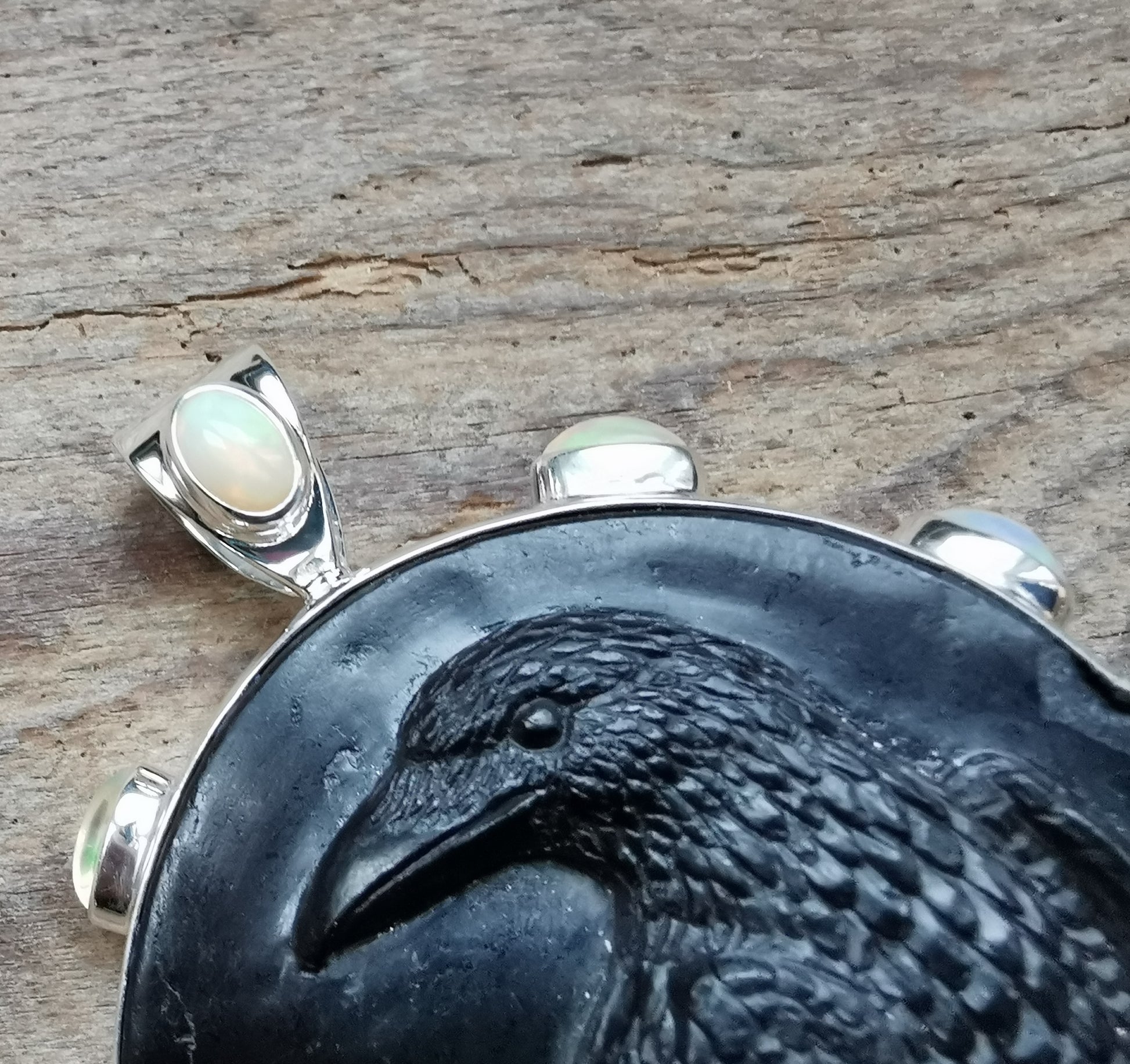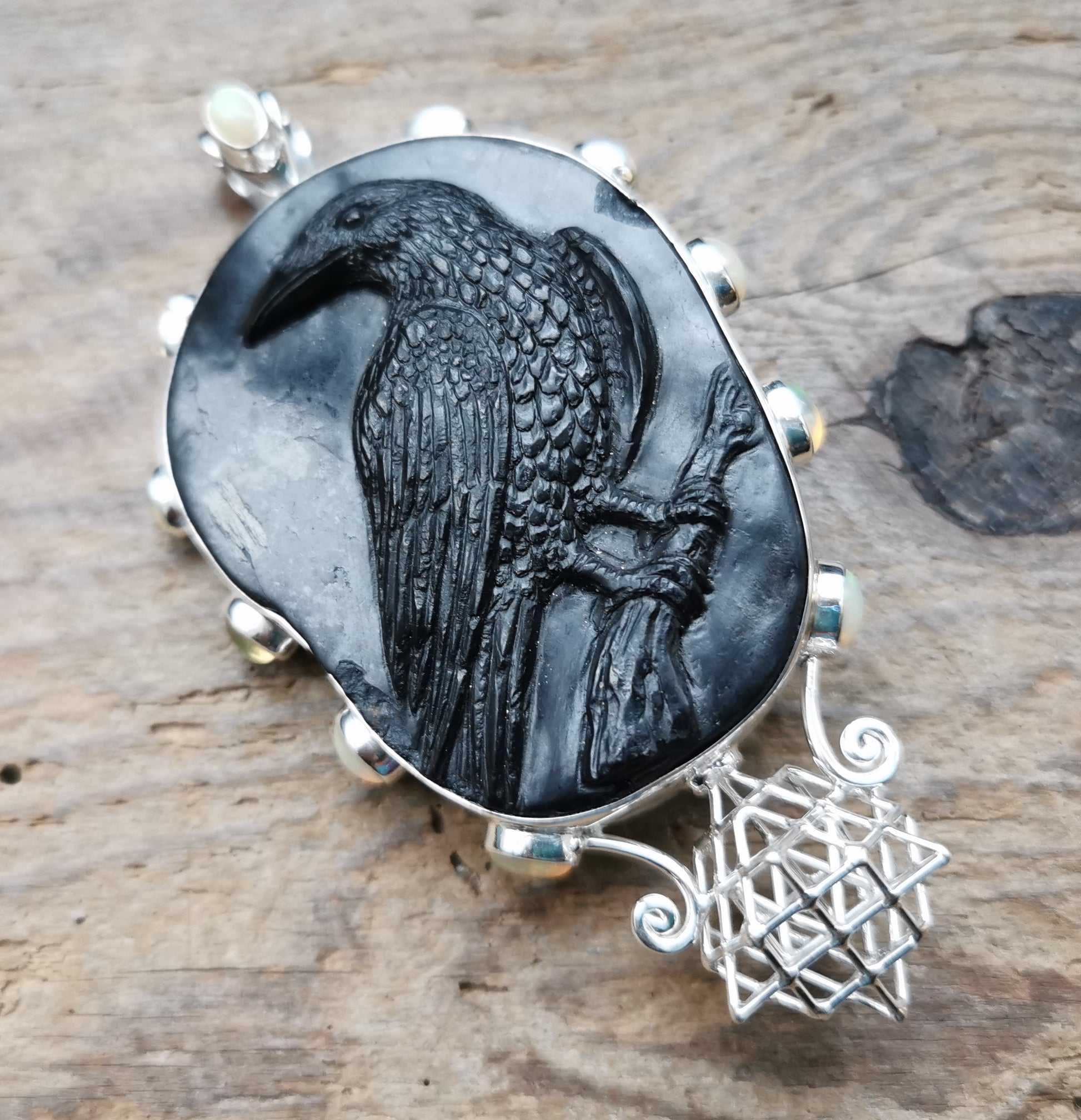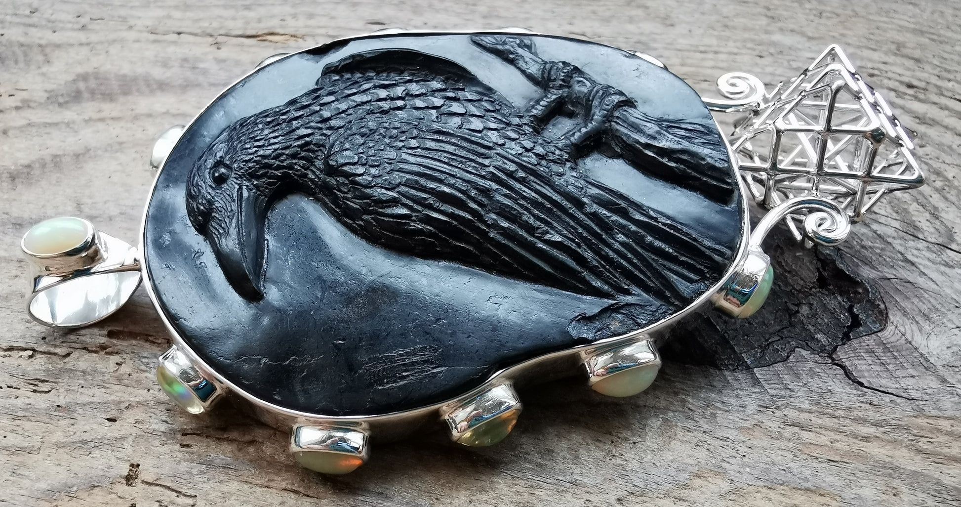 Ref.PD0825 - Silver pendant with Tantric Terra Prana geometry, jet carved raven, and opal gemstones.