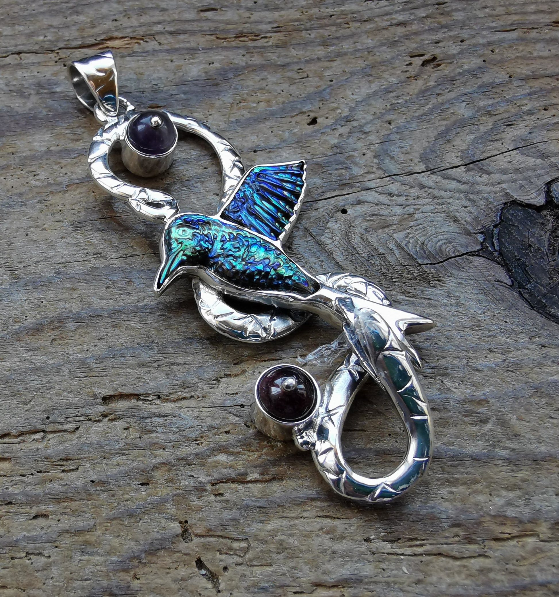 Ref.PD0831 - Silver pendant with snake motif, abalone carved hummingbird, and garnet gemstone.