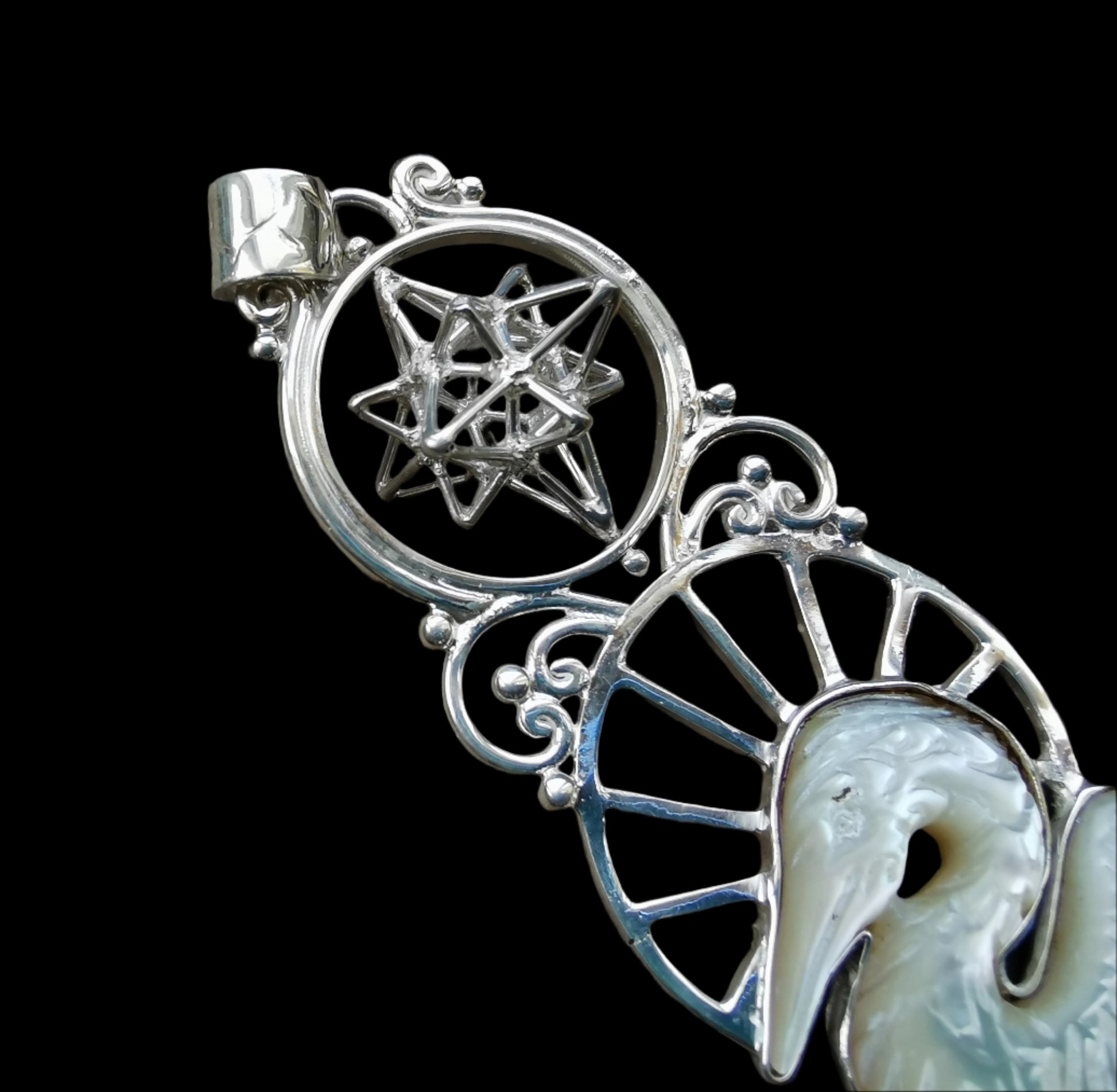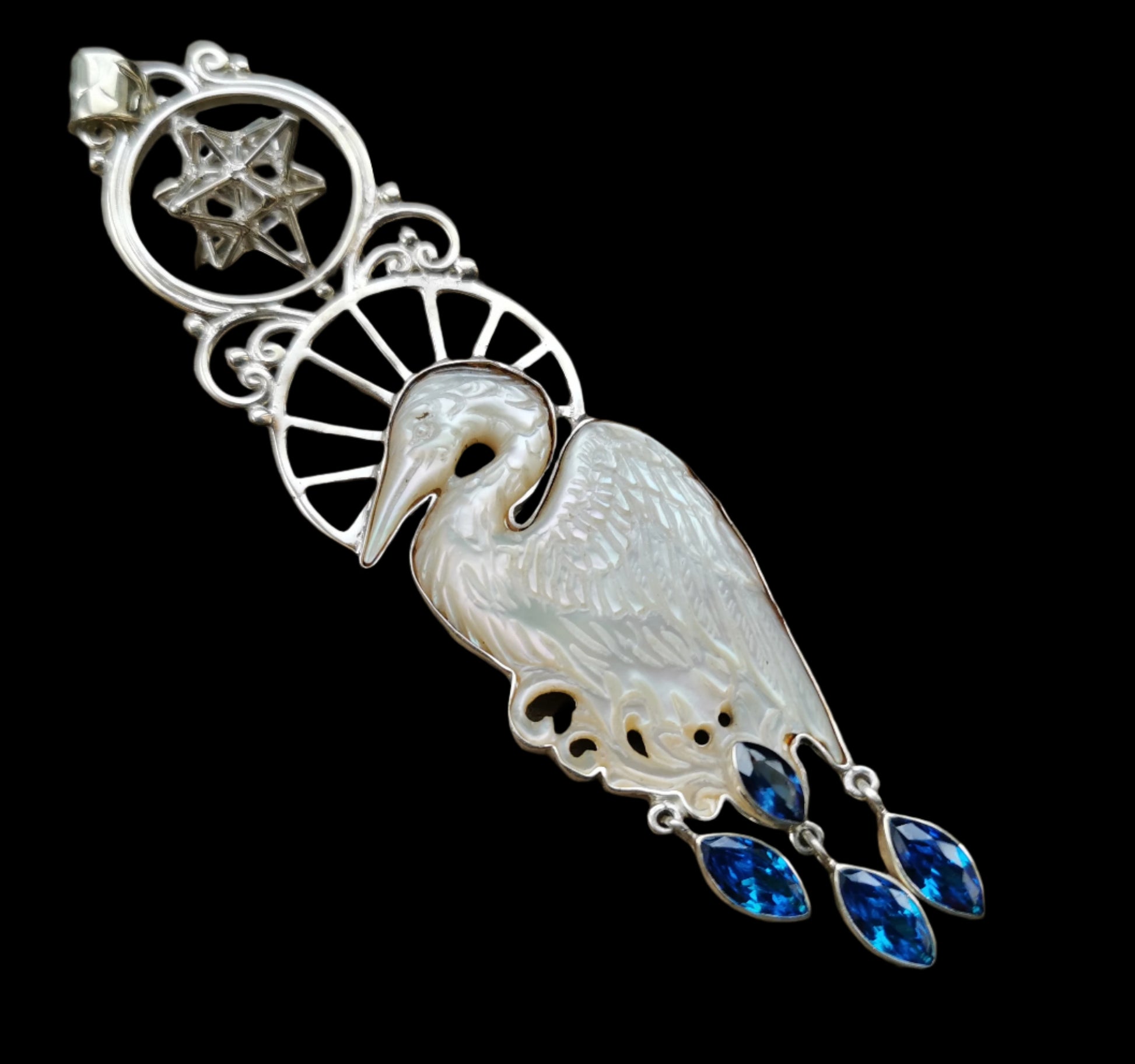 Ref.PD0833 - Silver pendant with Heart Star geometry, mother of pearl carved heron, and sapphire gemstones.