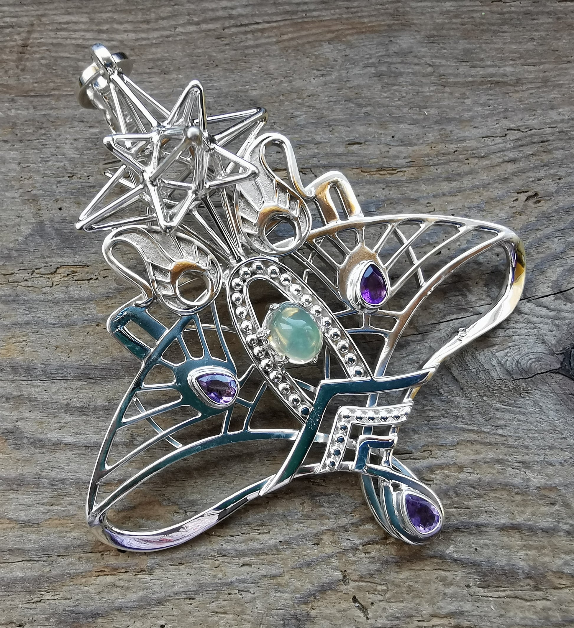 Ref.PD0835 - Silver pendant with Heart Star geometry, amethyst, and opal gemstones.