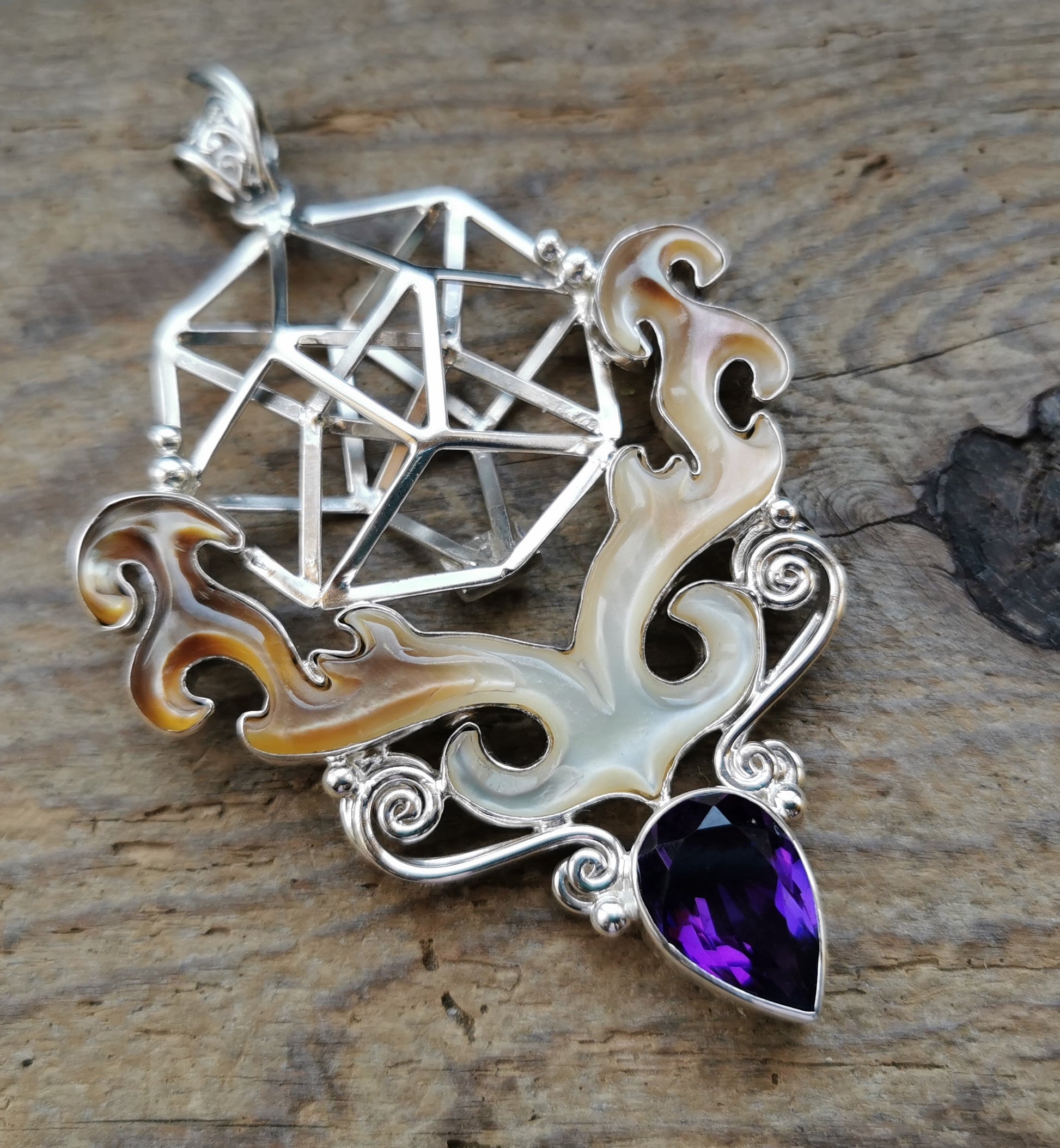 Ref.PD0837 - Silver pendant with Hyper Cube geometry, mother of pearl carved clouds, and amethyst gemstone.