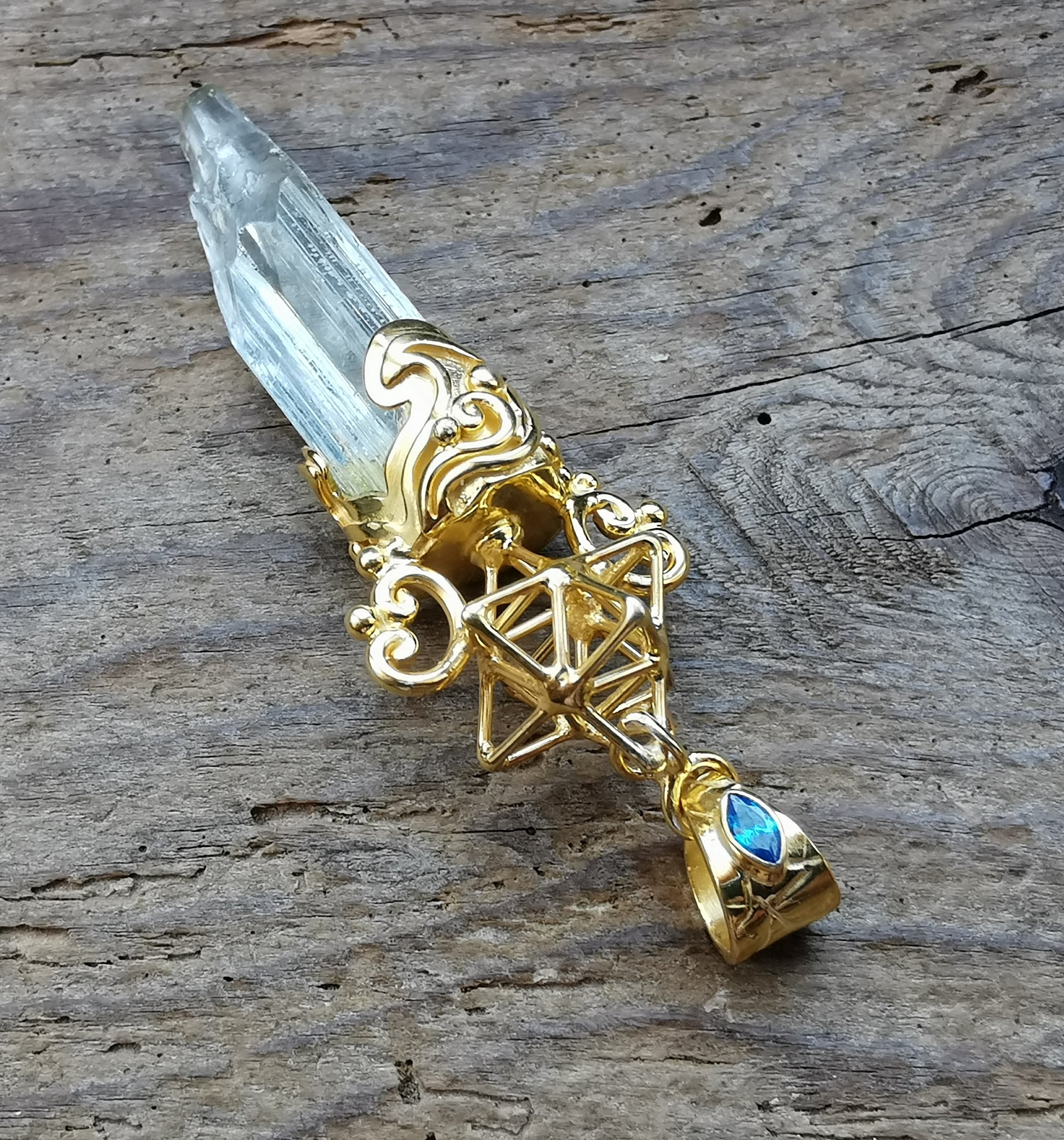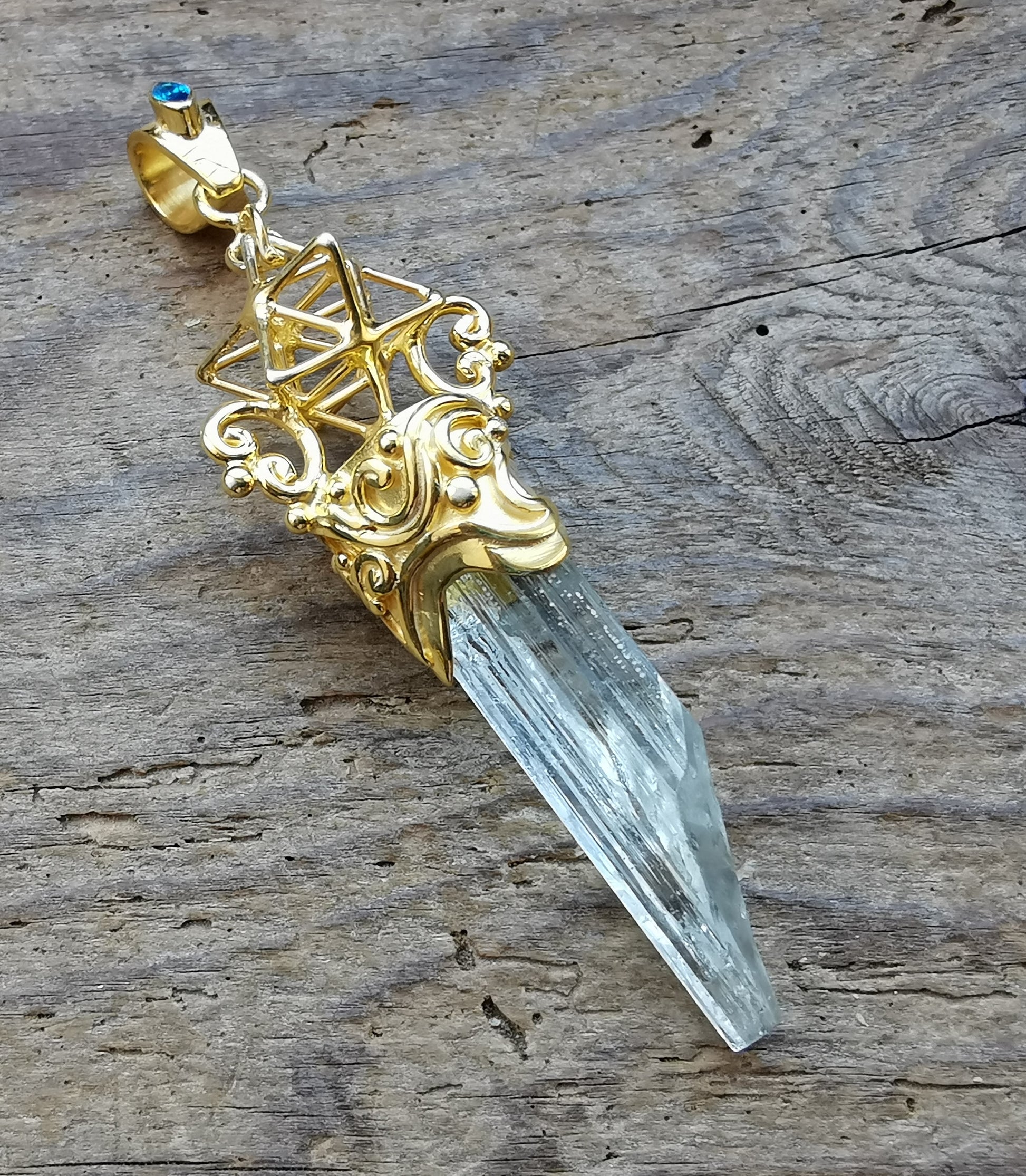 Ref.PD0839 - Golden plated on silver pendant with Tantric Star geometry, aqua marine, and apatite gemstones.