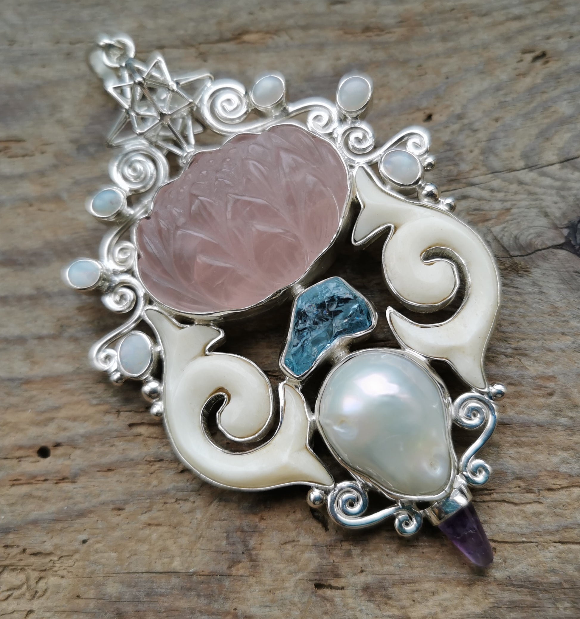 Ref.PD0841 - Silver pendant with Heart Star geometry, mother of pearl carved leaves, pearl, rose quartz carved lotus flower, opal, aquamarine, and amethyst gemstones.