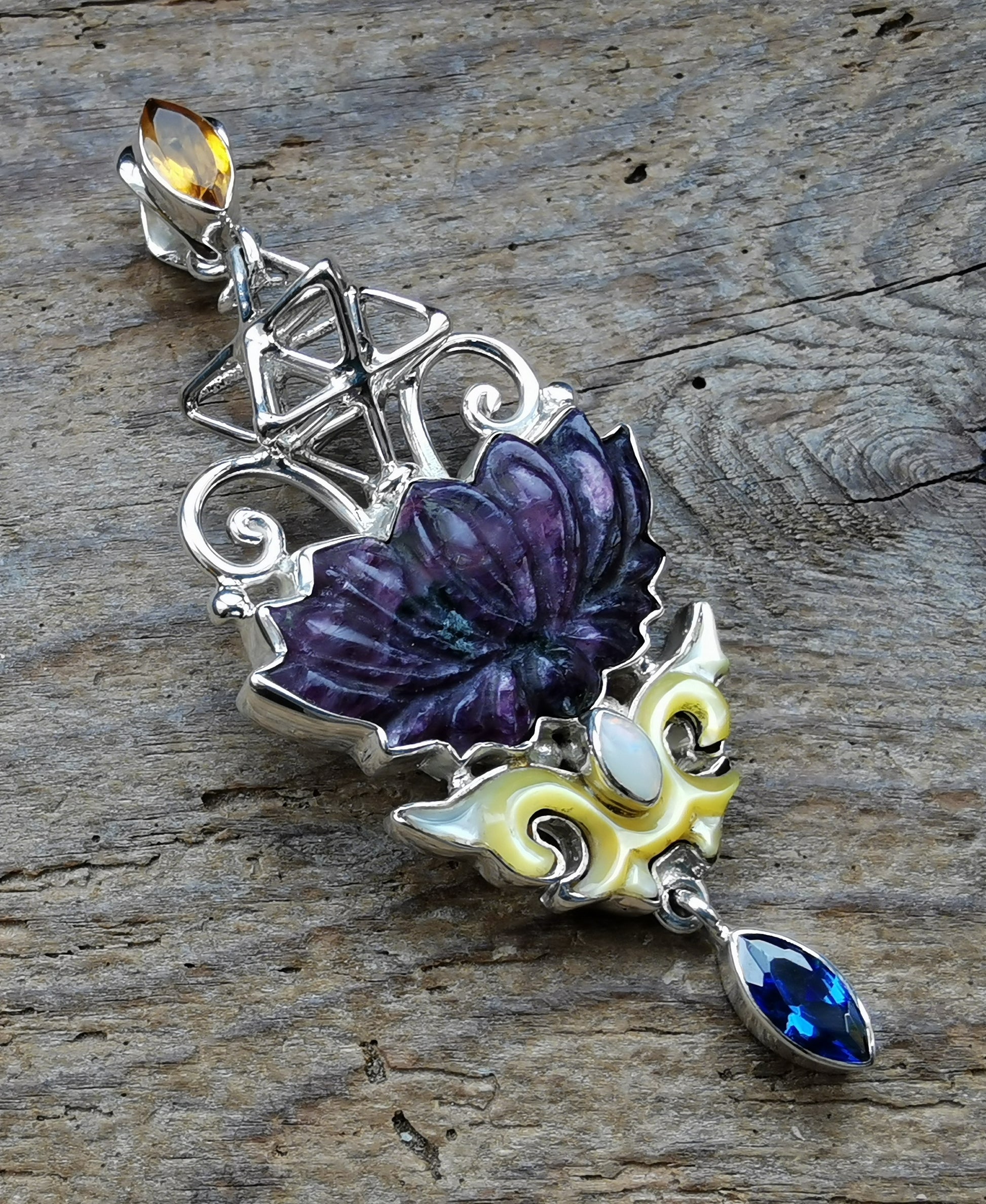 Ref.PD0842 - Silver pendant with Tantric Star geometry, mother of pearl carved leaves, sugilite carved lotus flower, Mexican opal, Ethiopian opal, and sapphire gemstones.