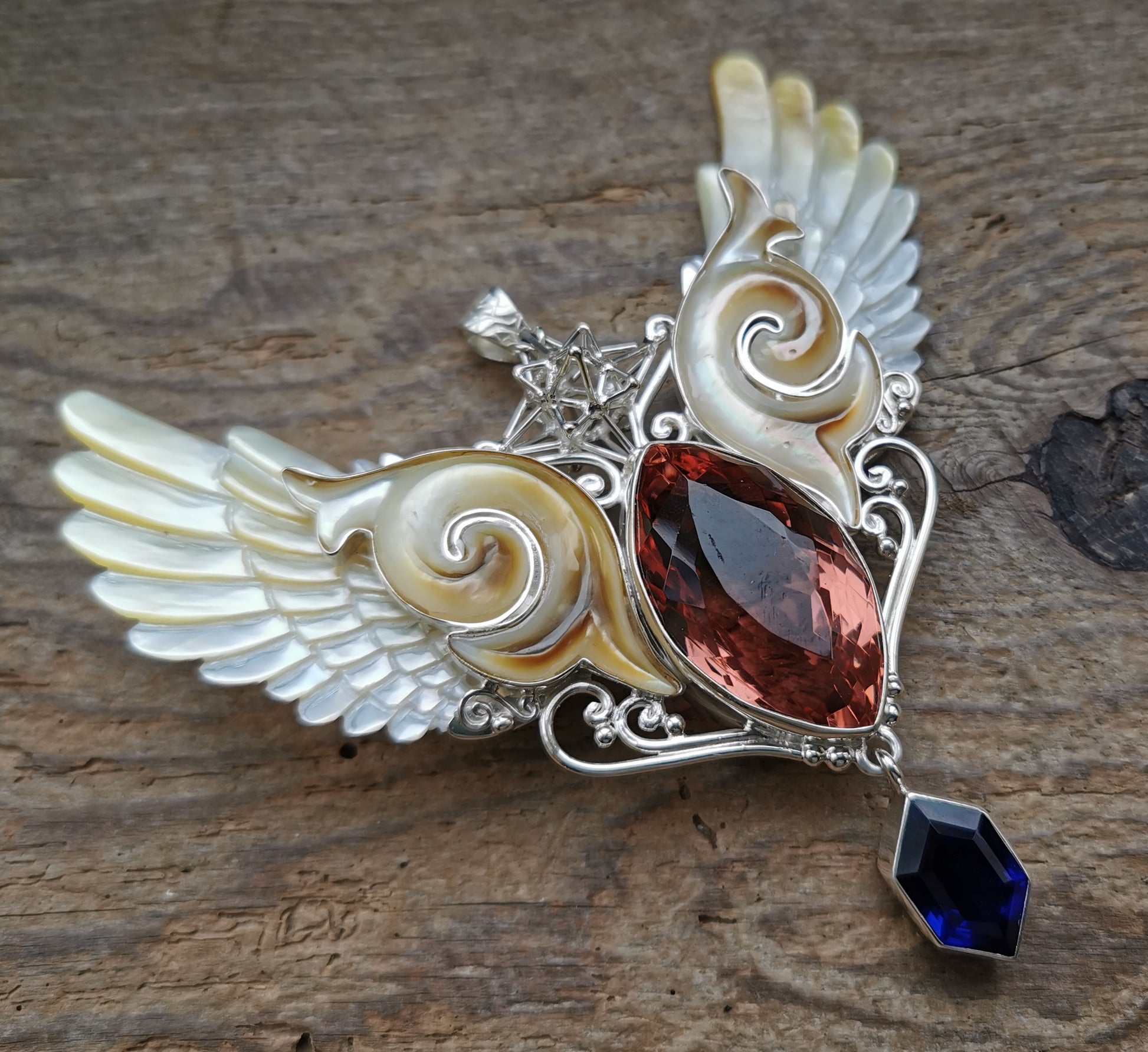 Ref.PD0843 - Silver pendant with Heart Star geometry, mother of pearl carved wings, sapphire, and amethyst gemstones.