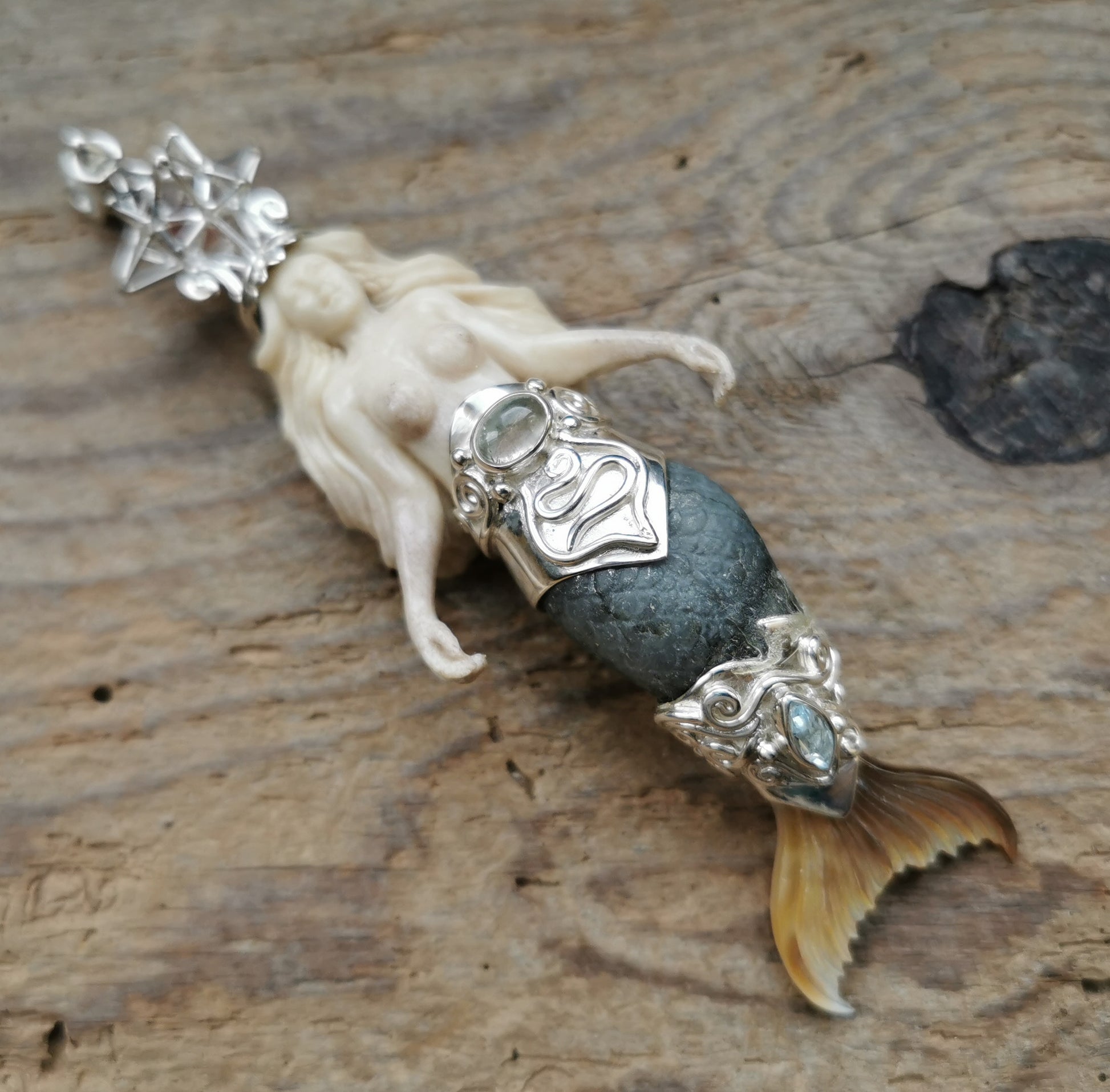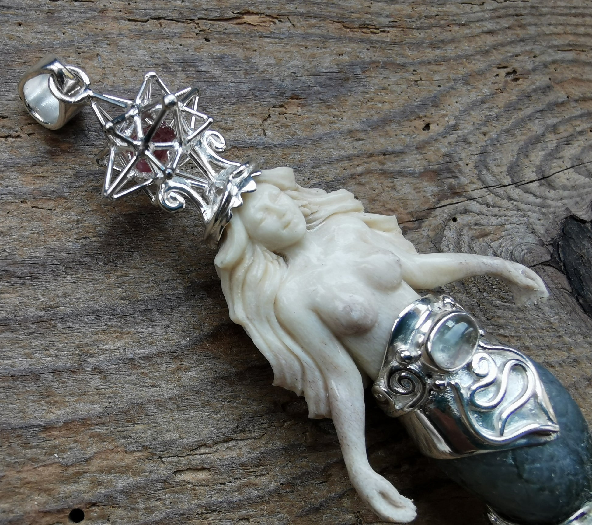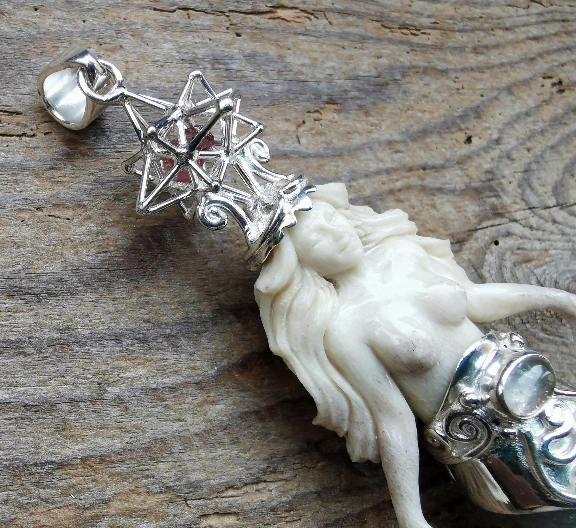 Ref.PD0844 - Silver pendant with Heart Star geometry & nested ruby, ecologically sourced deer horn carved mermaid, mother of pearl carved tail, labradorite, sky blue topaz, and opal gems.
