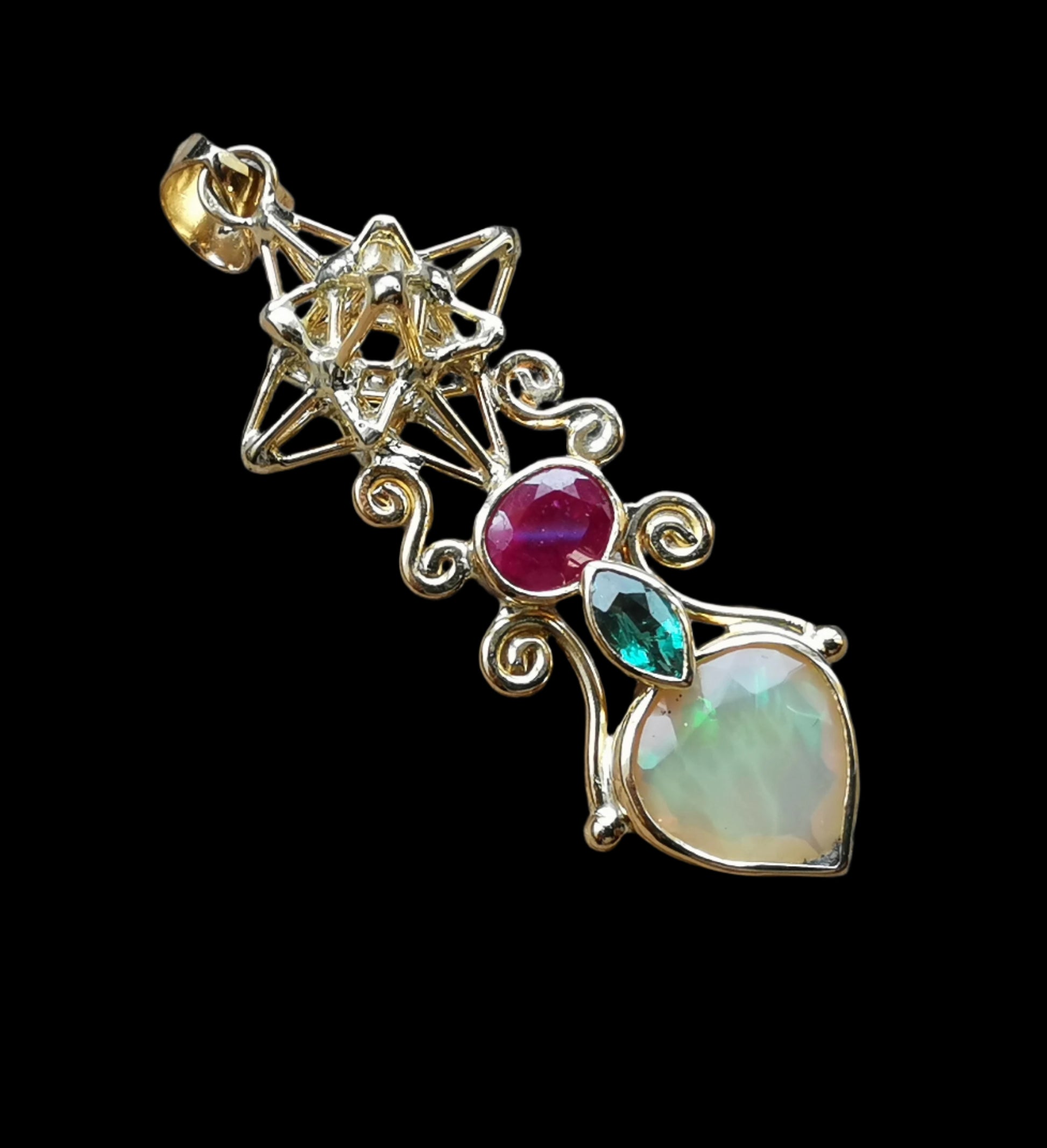 Ref.PD0845 - 18k gold pendant with Heart Star geometry, ruby, emerald, and opal gemstones.
