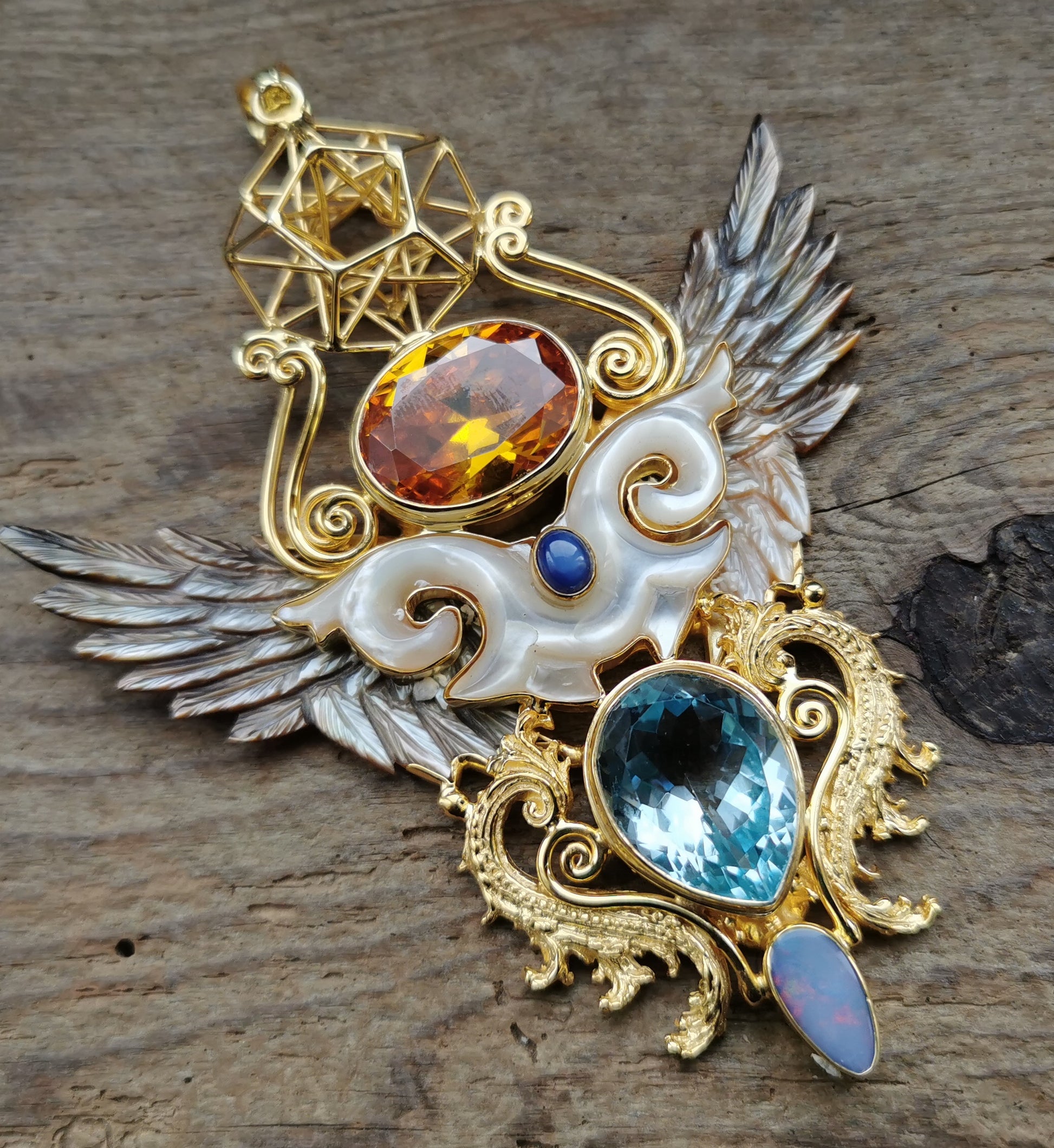Ref.PD0846 - Gold plated on silver pendant with 5D Hyper Dodecahedron geometry, mother of pearl carved wings & clouds, citrine, sapphire, London topaz, and opal gemstones.