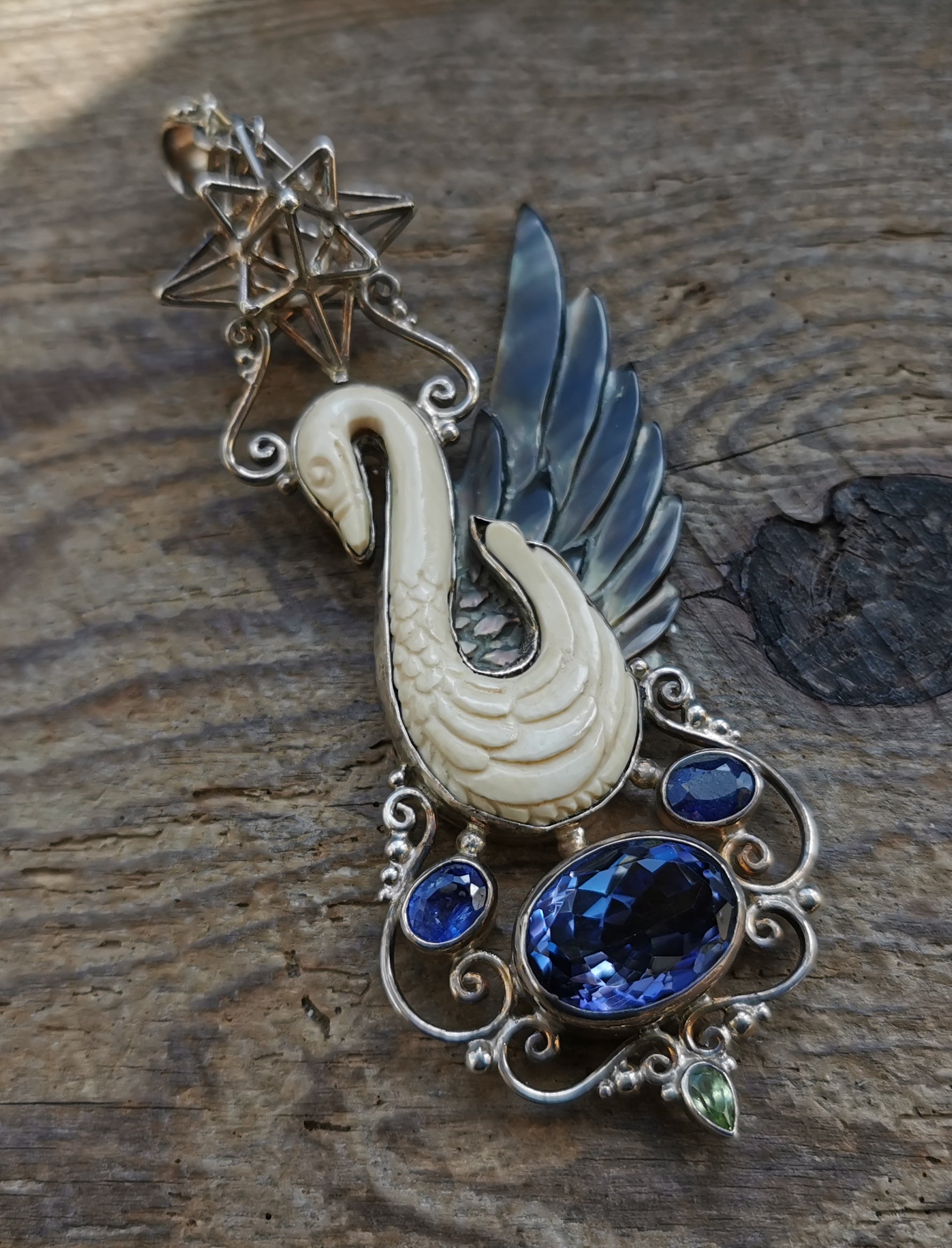 Ref.PD0853 - Silver pendant with Heart Star geometry, ecologically sourced deer horn carved swan, mother of pearl carved wings, peridot, and sapphire gemstones.