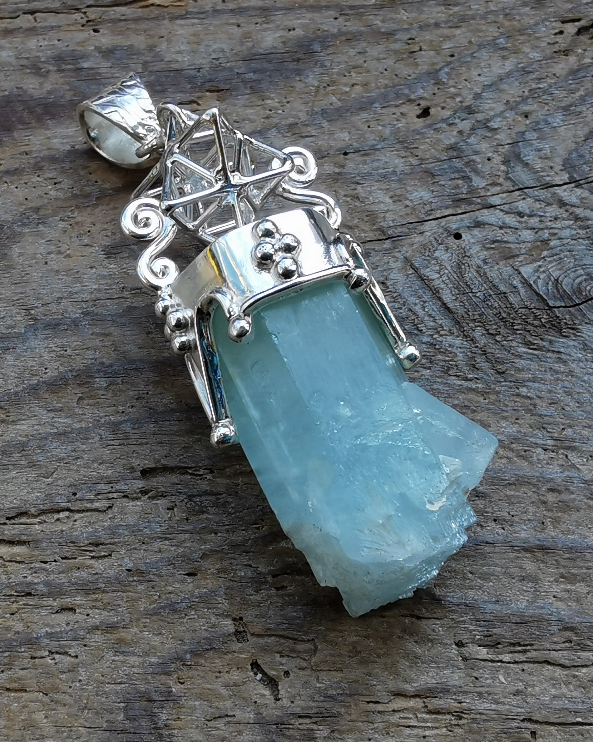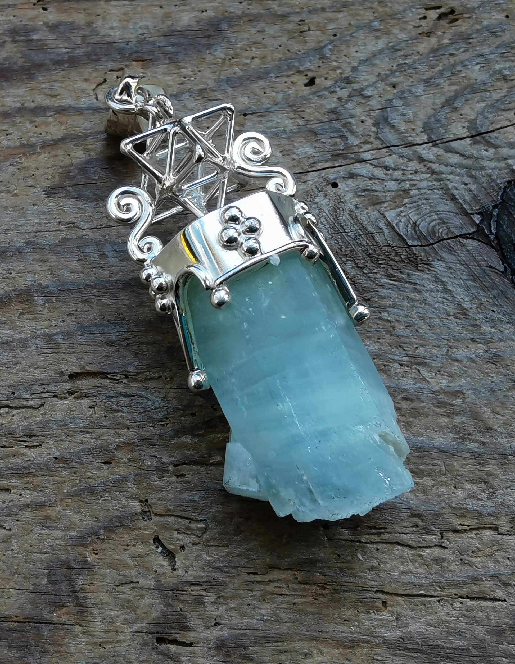 Ref.PD0856 - Silver pendant with Tantric Star geometry, and aqua marine gemstone.