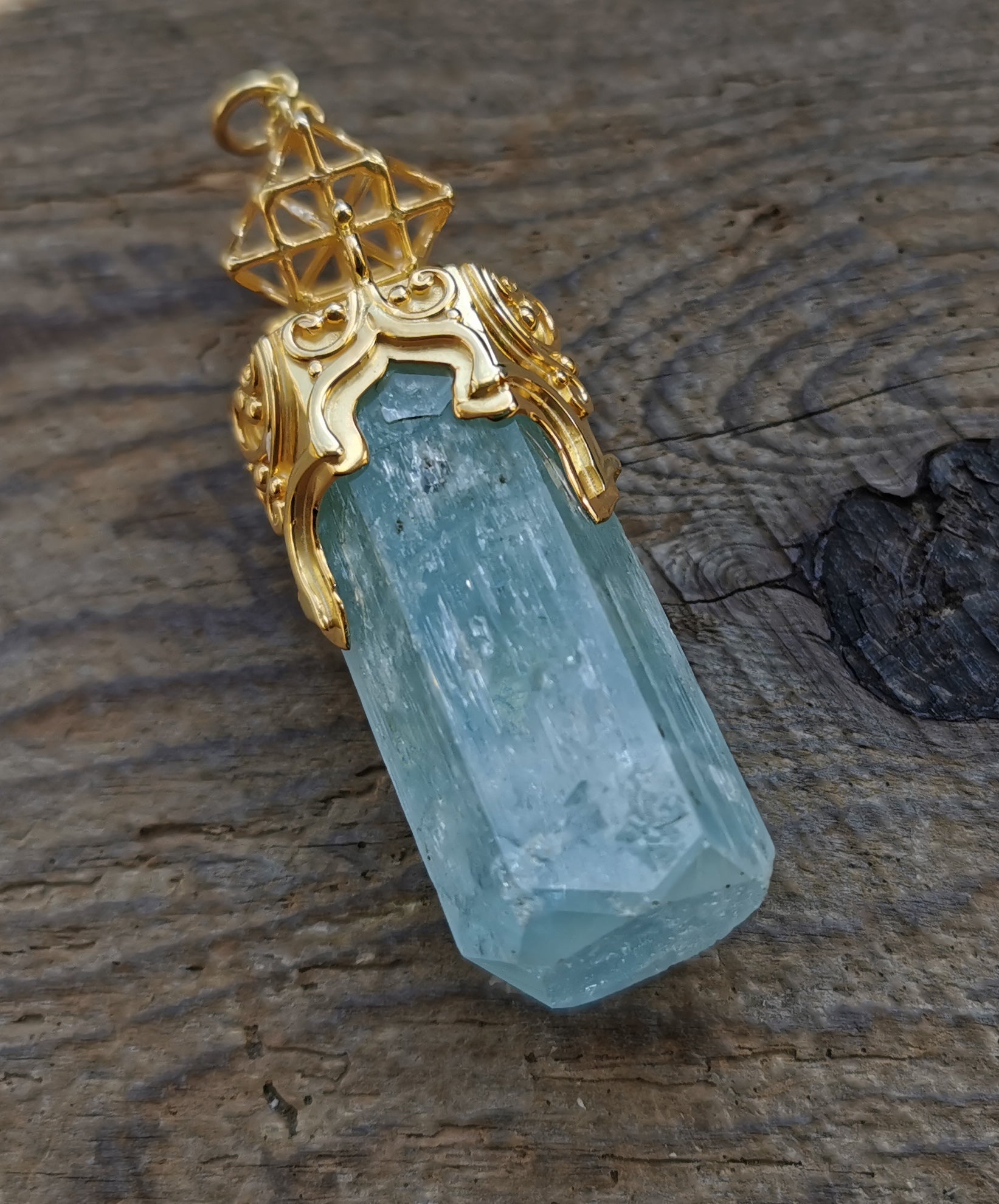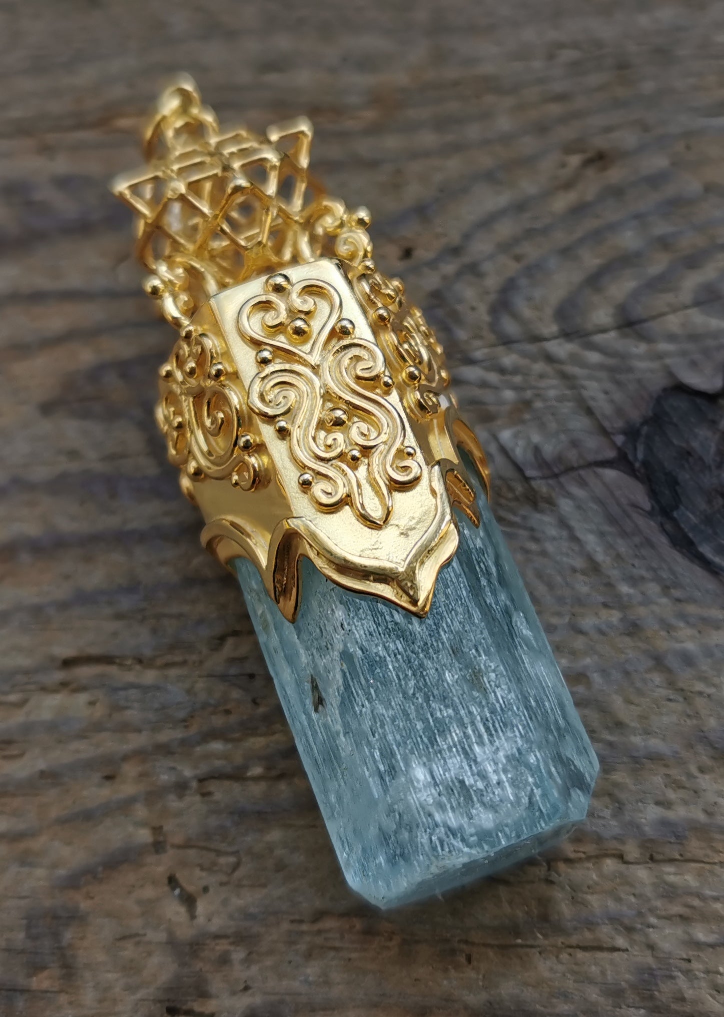 Ref.PD0857 - Golden plated on silver pendant with Tantric Terra Prana geometry, and aqua marine gemstone.