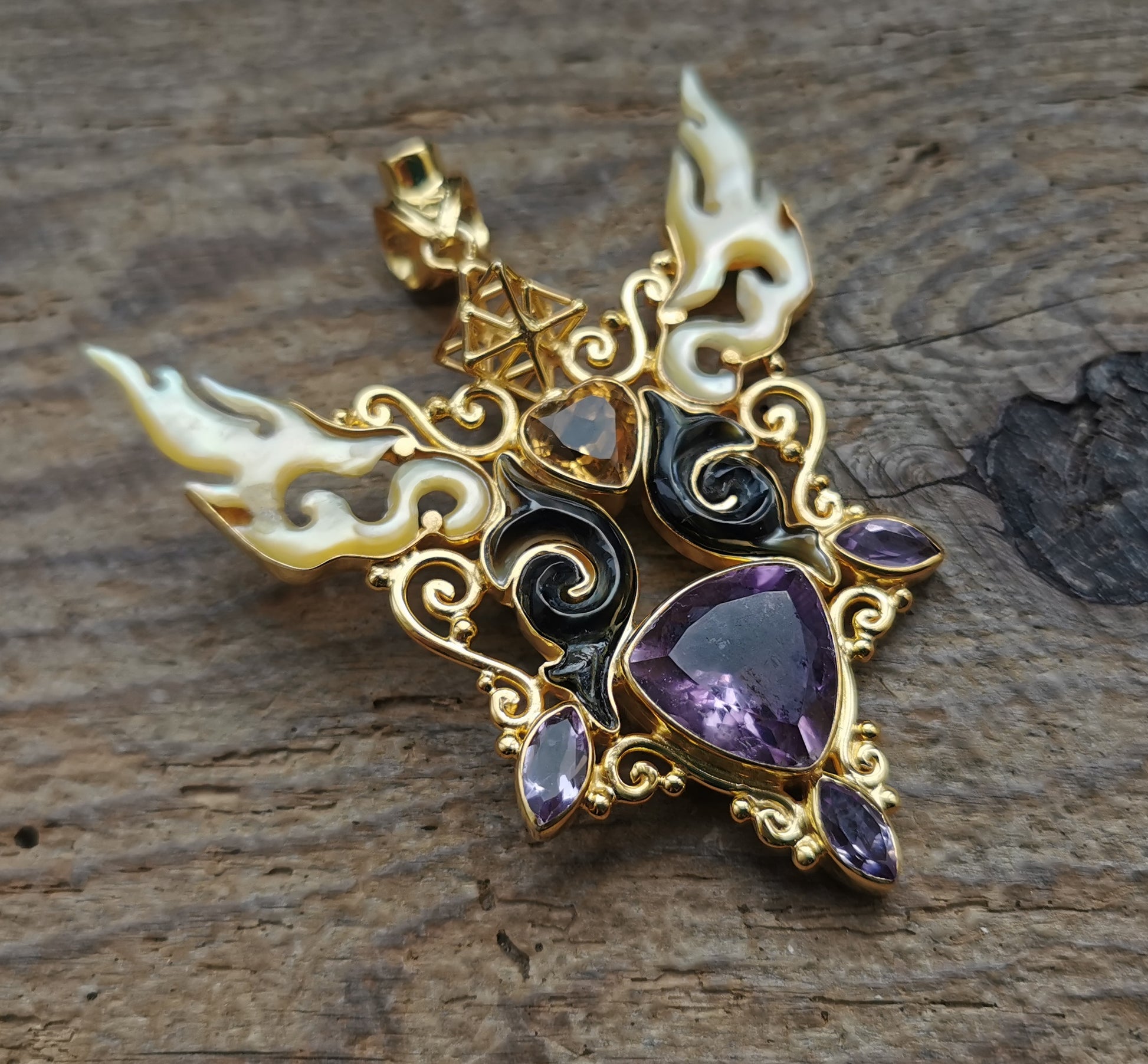 Ref.PD0858 - Golden plated on silver pendant with Tantric Star geometry, mother of pearl carved fire motif, citrine [heart], cubic zirconia [bale], and amethyst gemstones.
