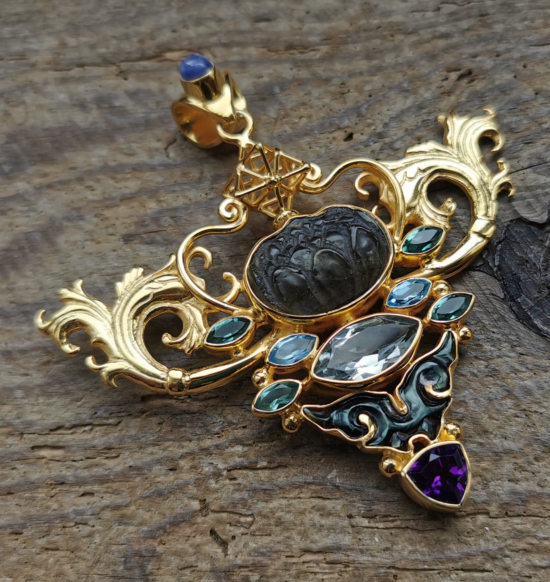 Ref.PD0863 - Golden plated on silver pendant with Tantric Star geometry, mother of pearl carved cloud motif, labradorite carved lotus flower, blue sapphire [bale], blue topaz, emerald, and amethyst gemstones.