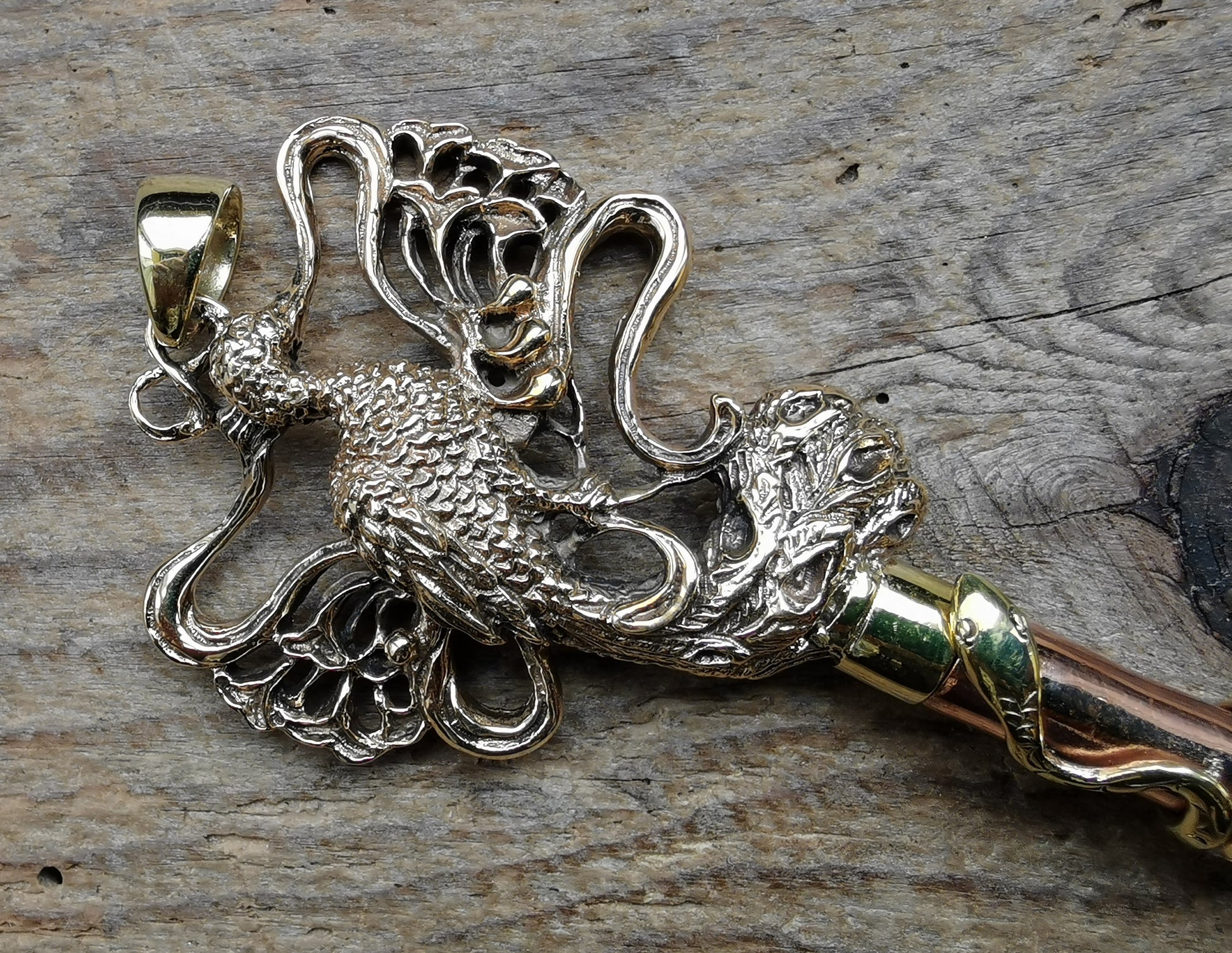 Ref.PD0865 - Brass/copper key pendant with hidden spoon plus peacock & snake motifs.