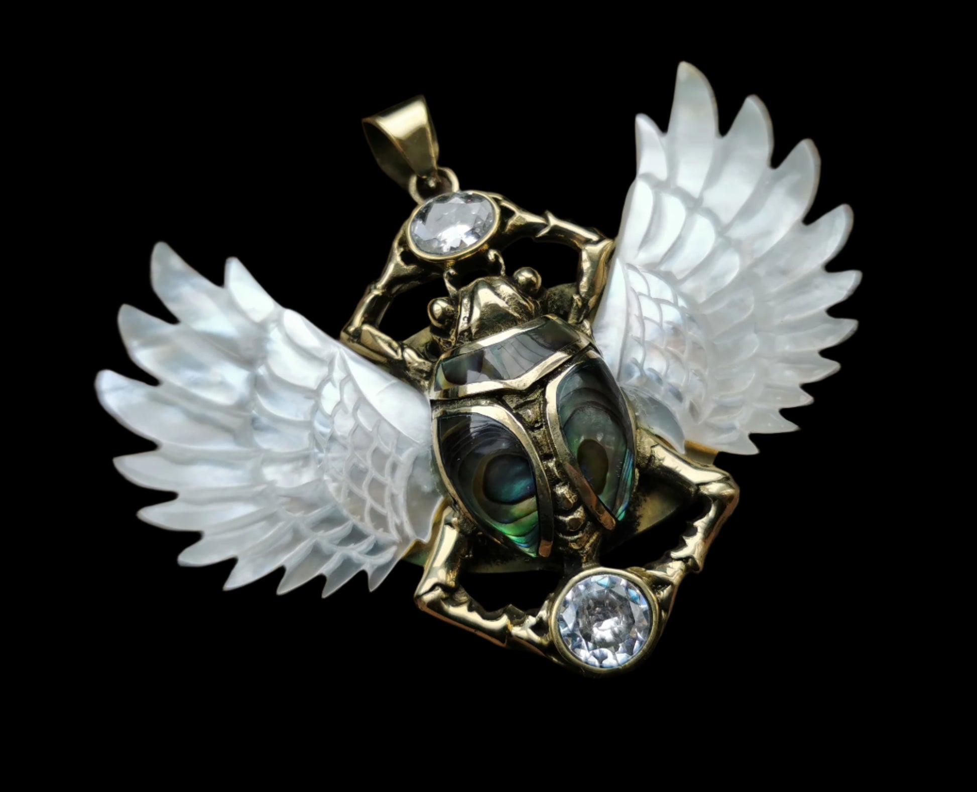Ref.PD0867 - Brass pendant with scarab motif decorated with abalone shells, zircon crystal, and mother of pearl carved wings.
