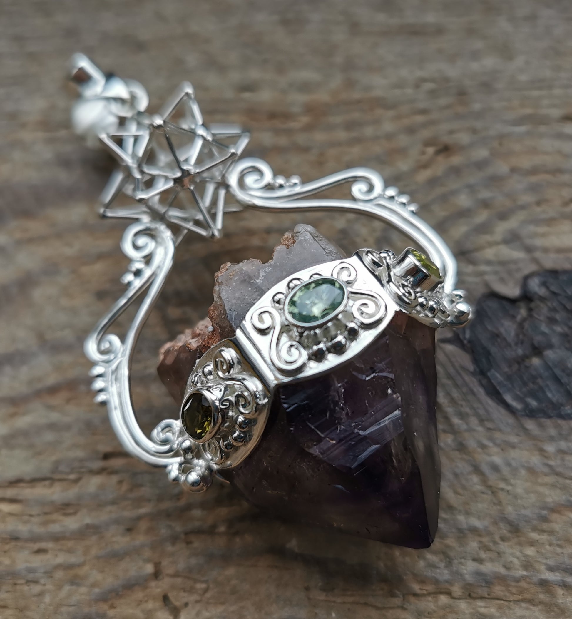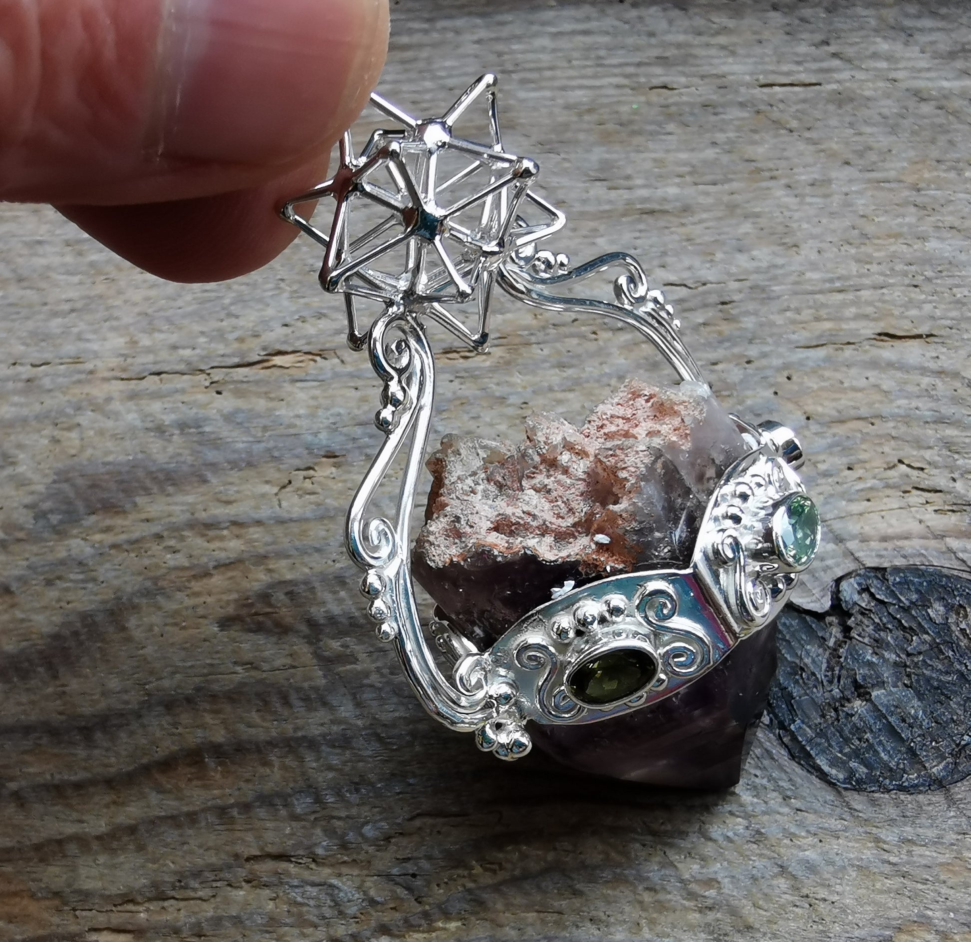 Ref.PD0874 - Silver pendant with Heart Star geometry, Brandberg amethyst, and tourmaline gemstones.