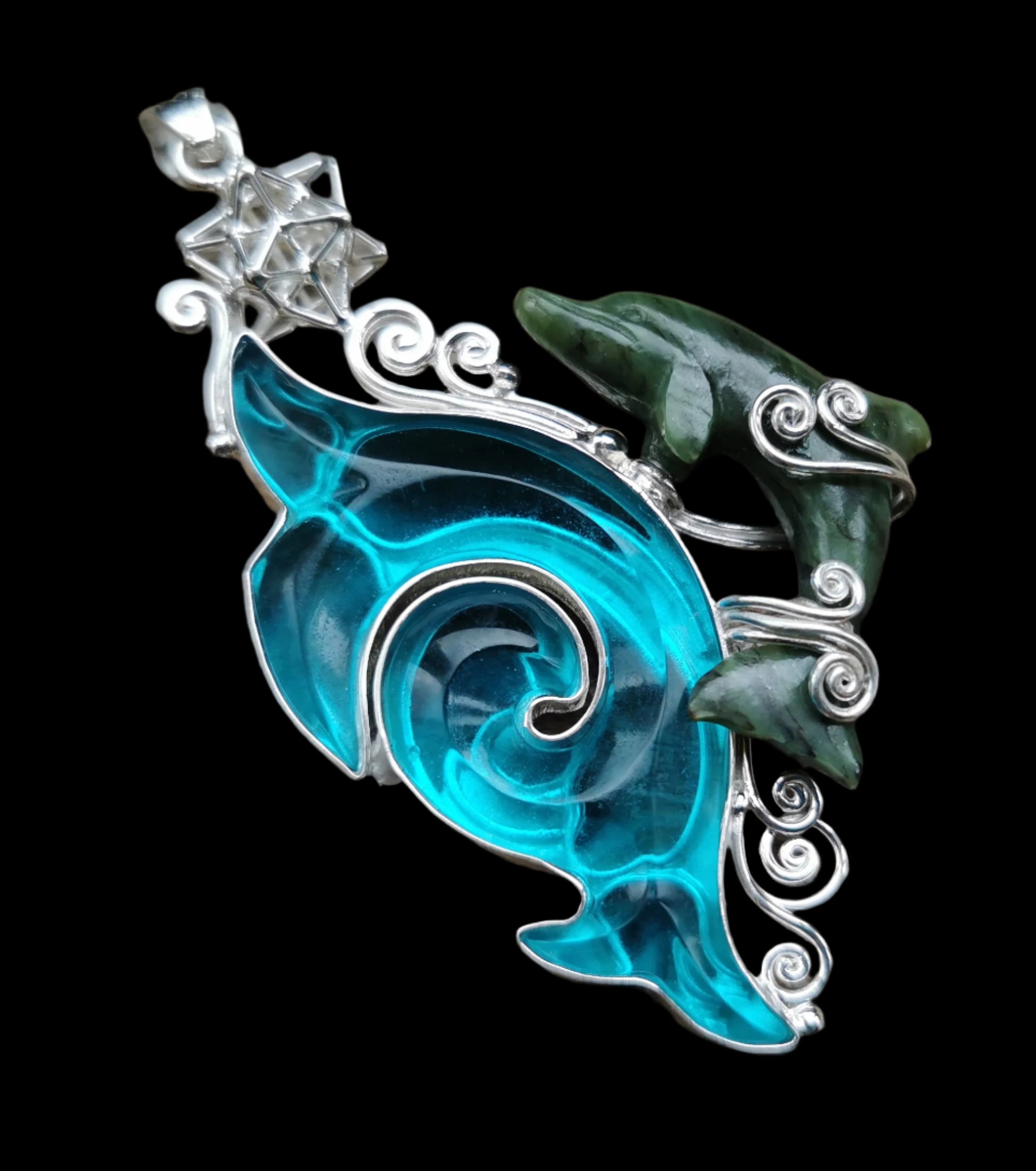 Ref.PD0875 - Silver pendant with Solar Star geometry, jade gemstone carved dolphin.
