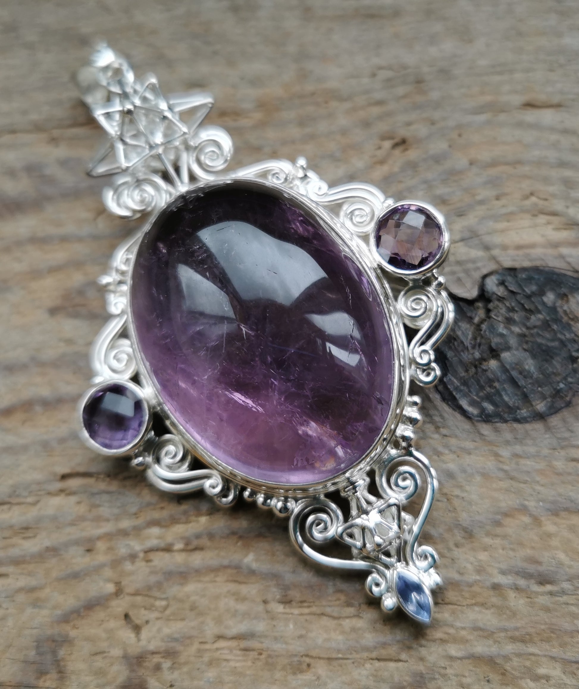 Ref.PD0876 - Silver pendant with Heart Star & Tantric Star geometries, amethyst, and tanzanite gemstones.