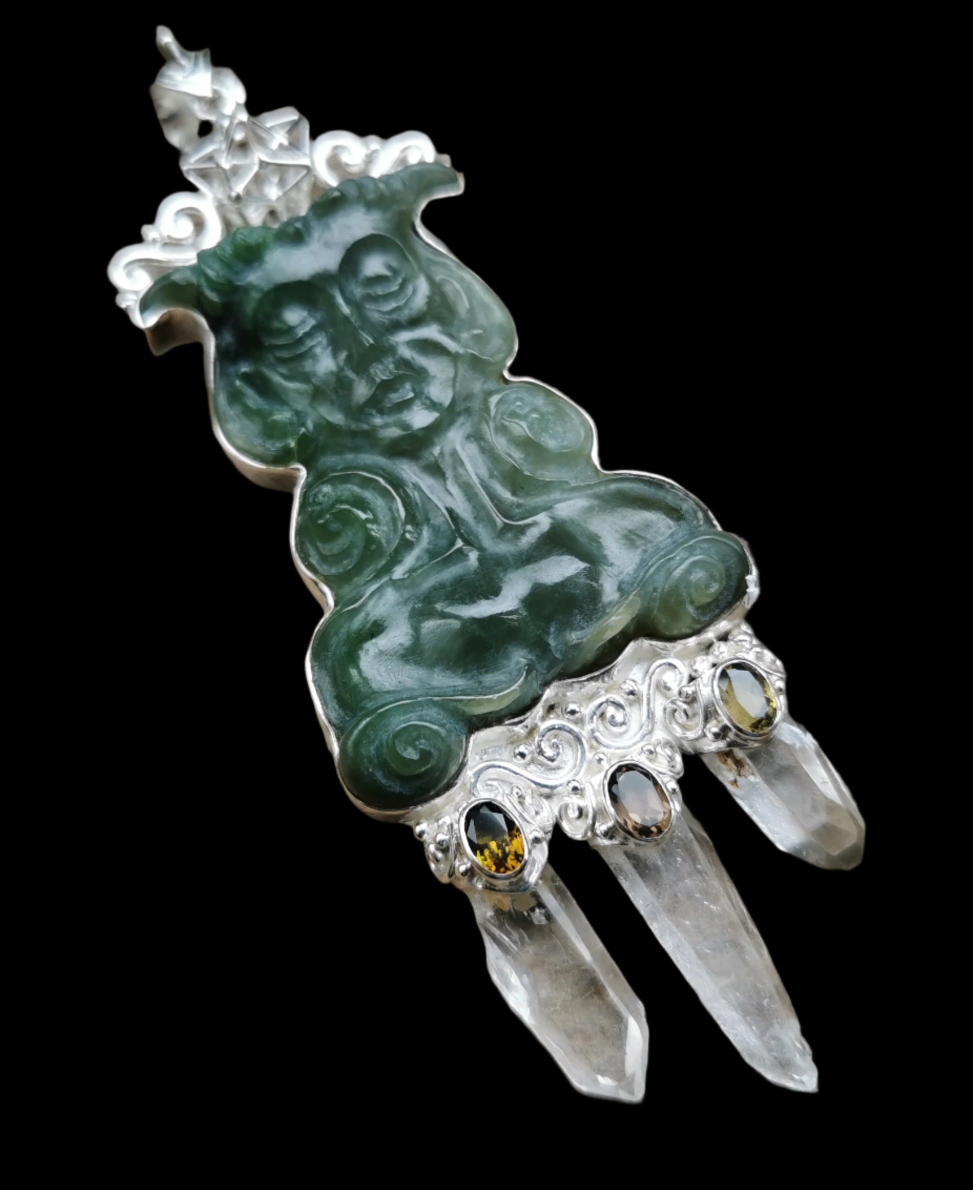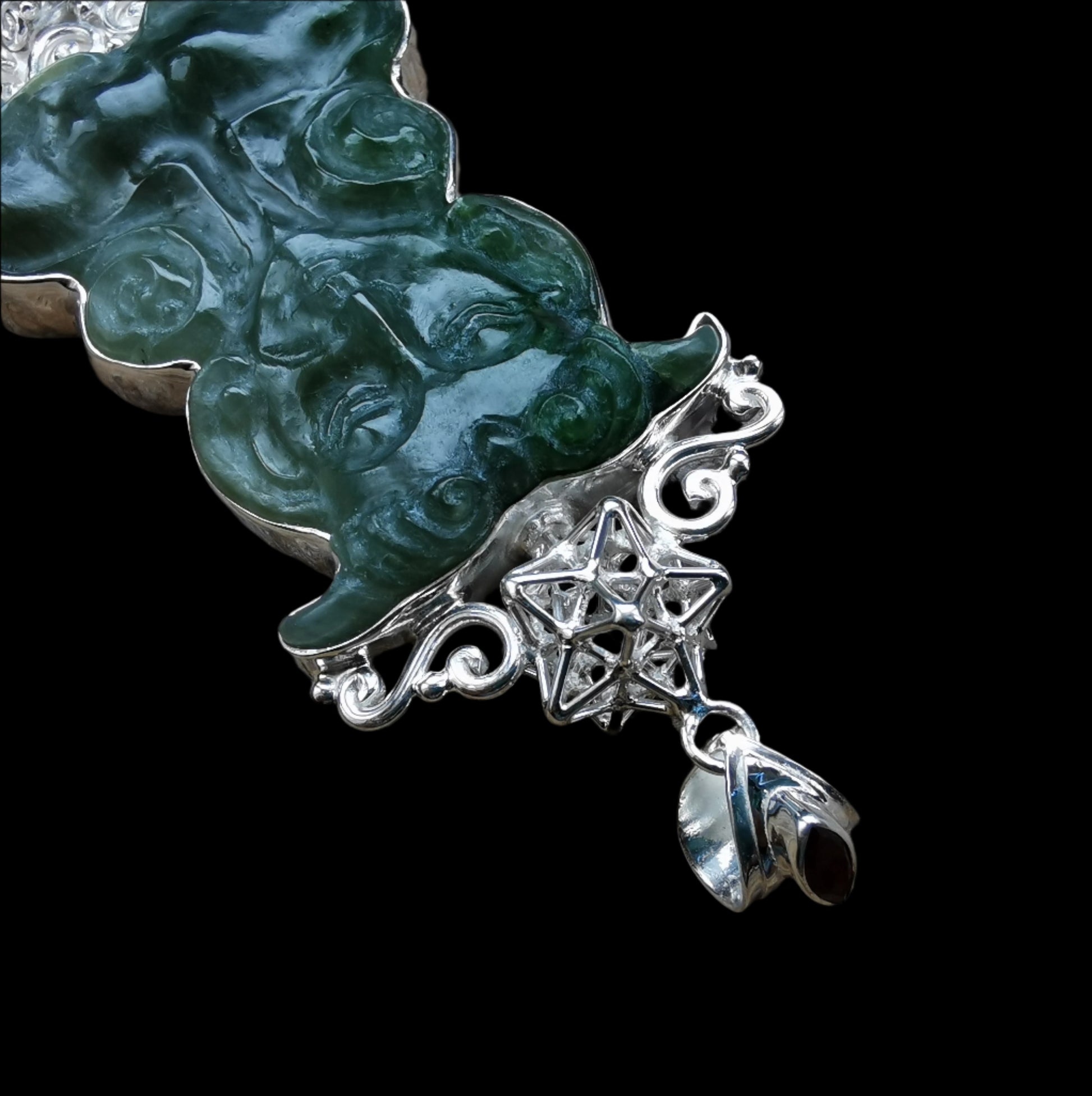 Ref.PD0877 - Silver pendant with Solar Star geometry, laser quartz crystal, jade carved fairy, garnet, and smoky topaz gemstones.
