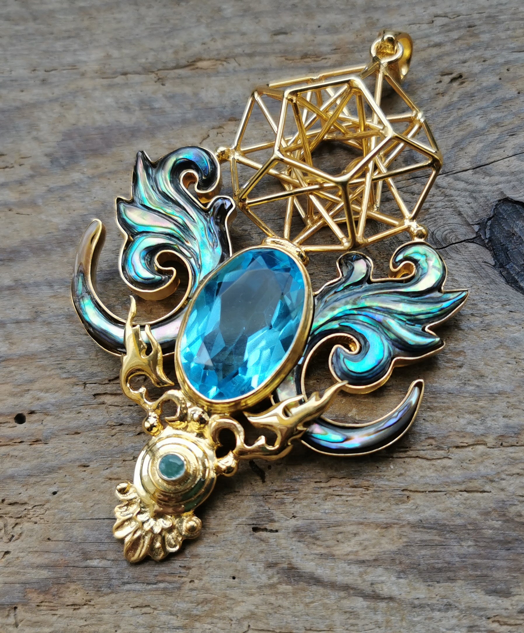 Ref.PD0882 - Gold plated on silver pendant with 5D Hyper Dodecahedron geometry, abalone carved flames, blue topaz, and emerald gemstones.