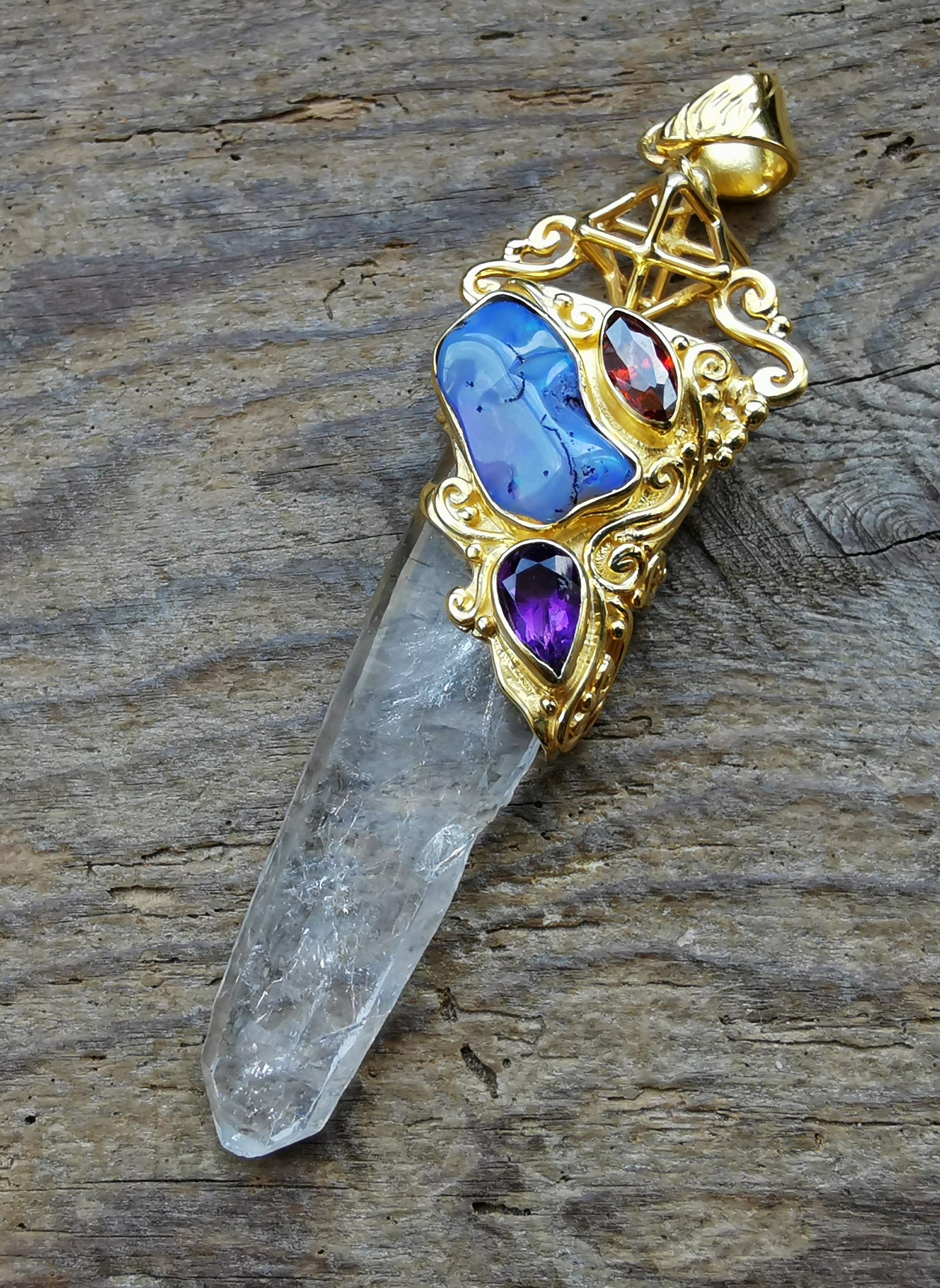 Ref.PD0886 - Gold plated on silver pendant with Star Tetrahedron geometry with laser quartz crystal, opal, garnet, and amethyst gemstones.