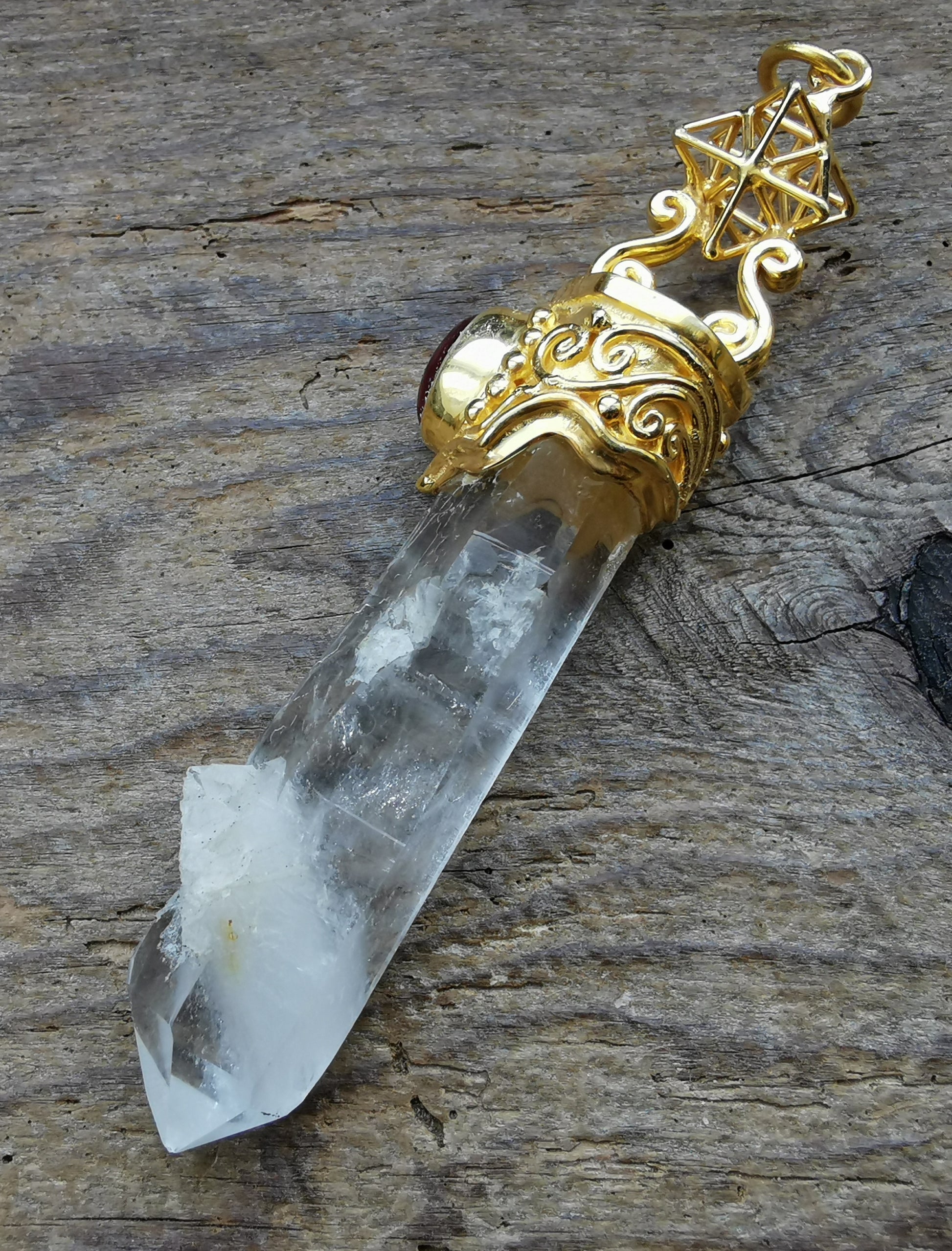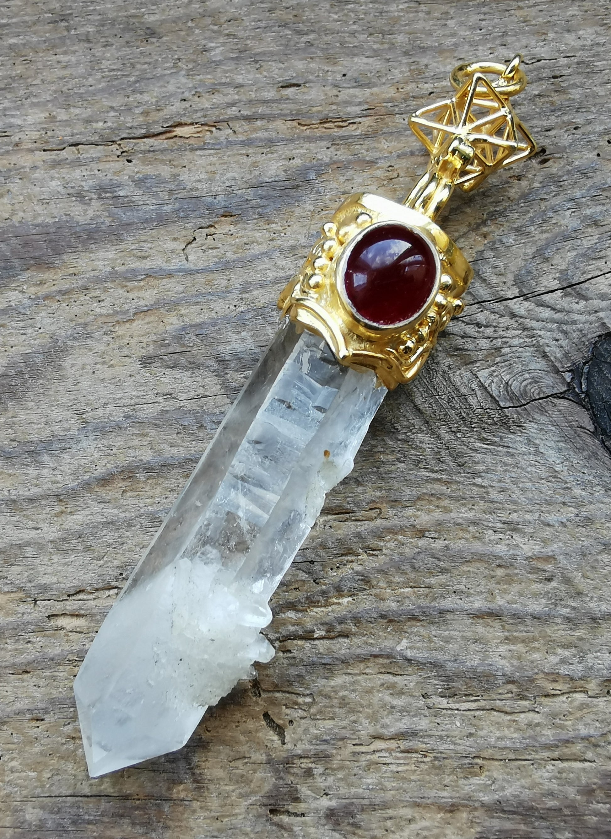 Ref.PD0887 - Golden plated on silver pendant with Tantric Star geometry, laser quartz crystal, and garnet gemstones.
