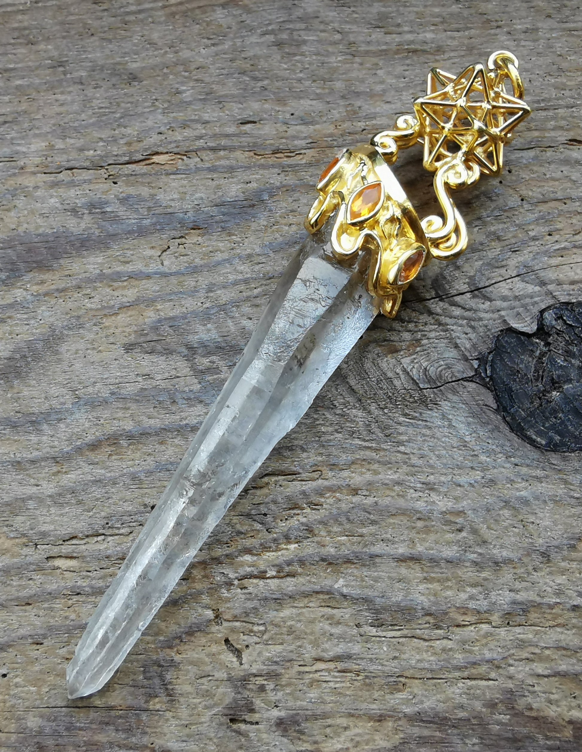 Ref.PD0888 - Gold plated on silver pendant with Solar Star geometry, laser quartz crystal, and Mexican opal gemstones.