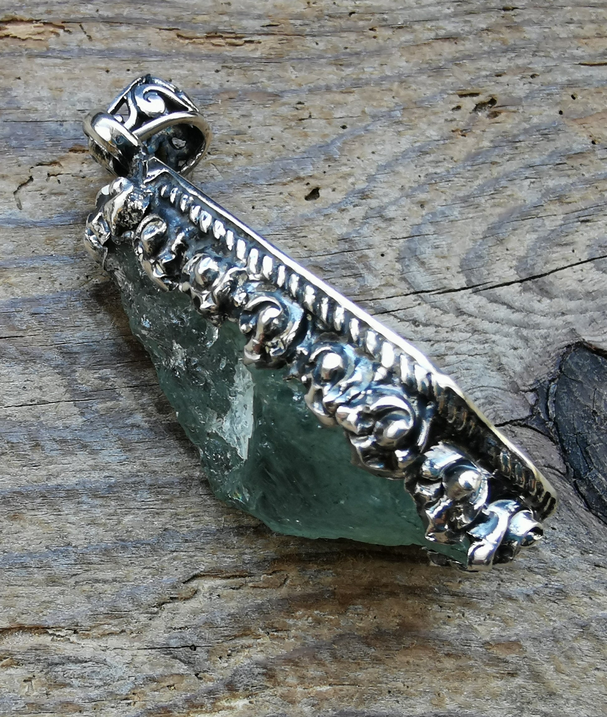 Ref.PD0890 - Silver repoussé pendant with aqua marine gemstone.