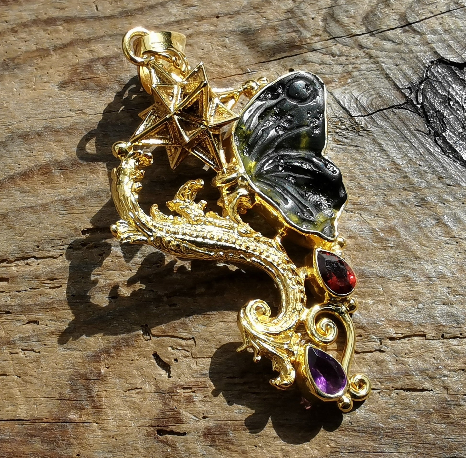 Ref.PD0891 - Gold plated on silver pendant with solid Heart Star geometry, moldavite carved butterfly, garnet, and amethyst gemstones.