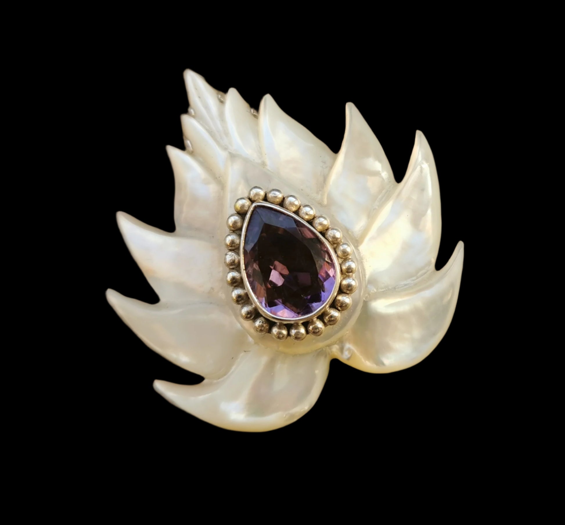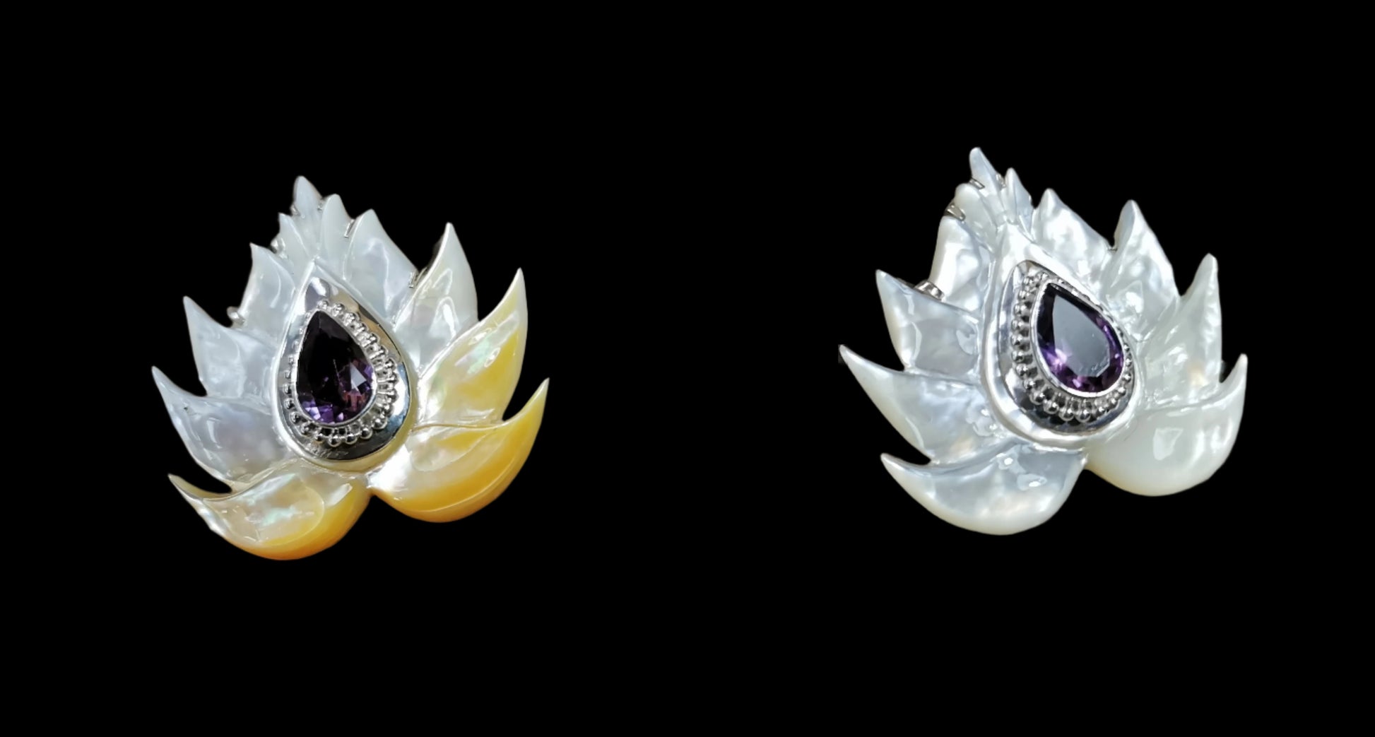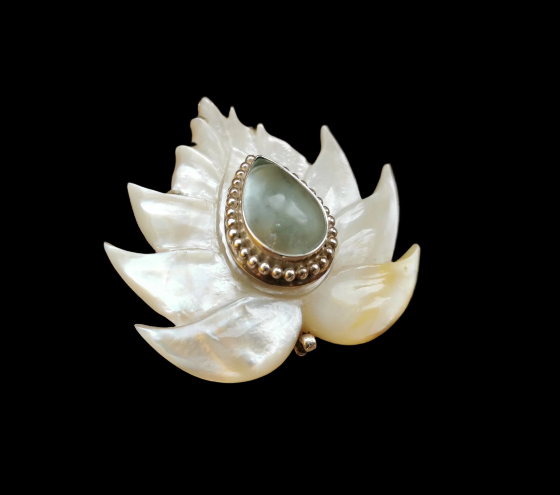Ref.PD0892 - Mother of pearl carved lotus flower with gemstone in silver setting.