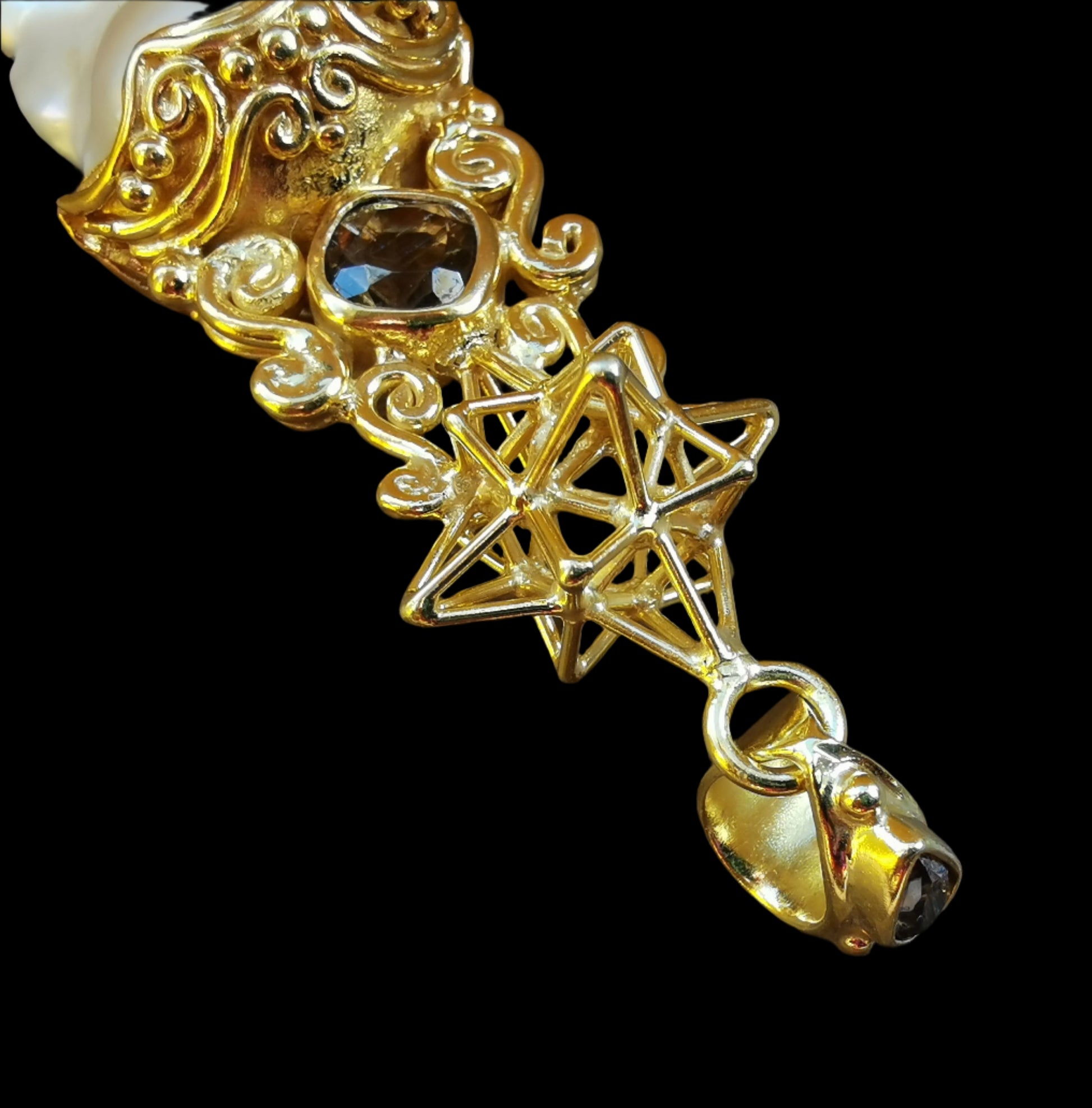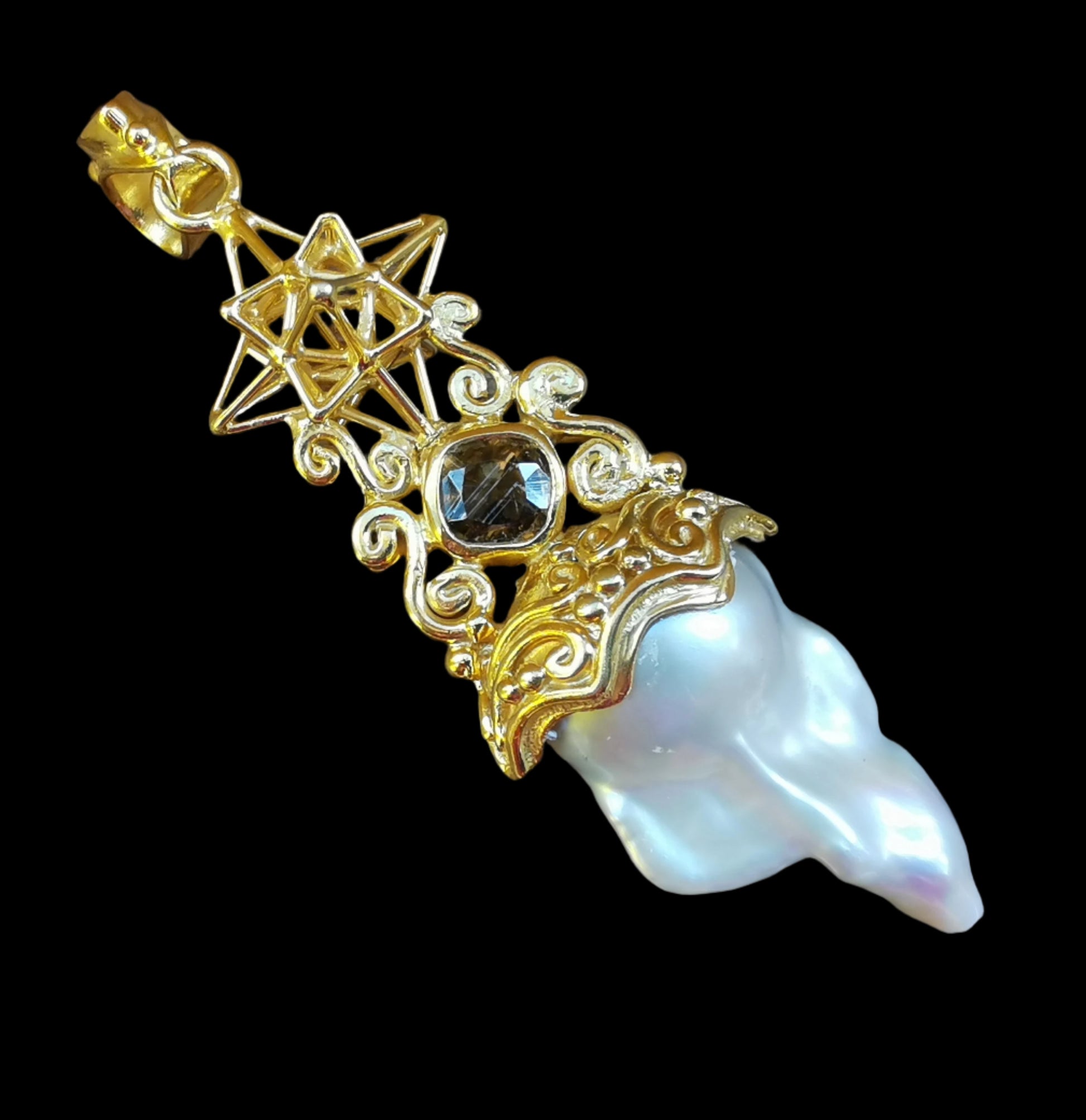 Ref.PD0897 - Gold plated on silver pendant with Heart Star geometry, South sea baroque pearl, smoky quartz, and citrine gemstones.