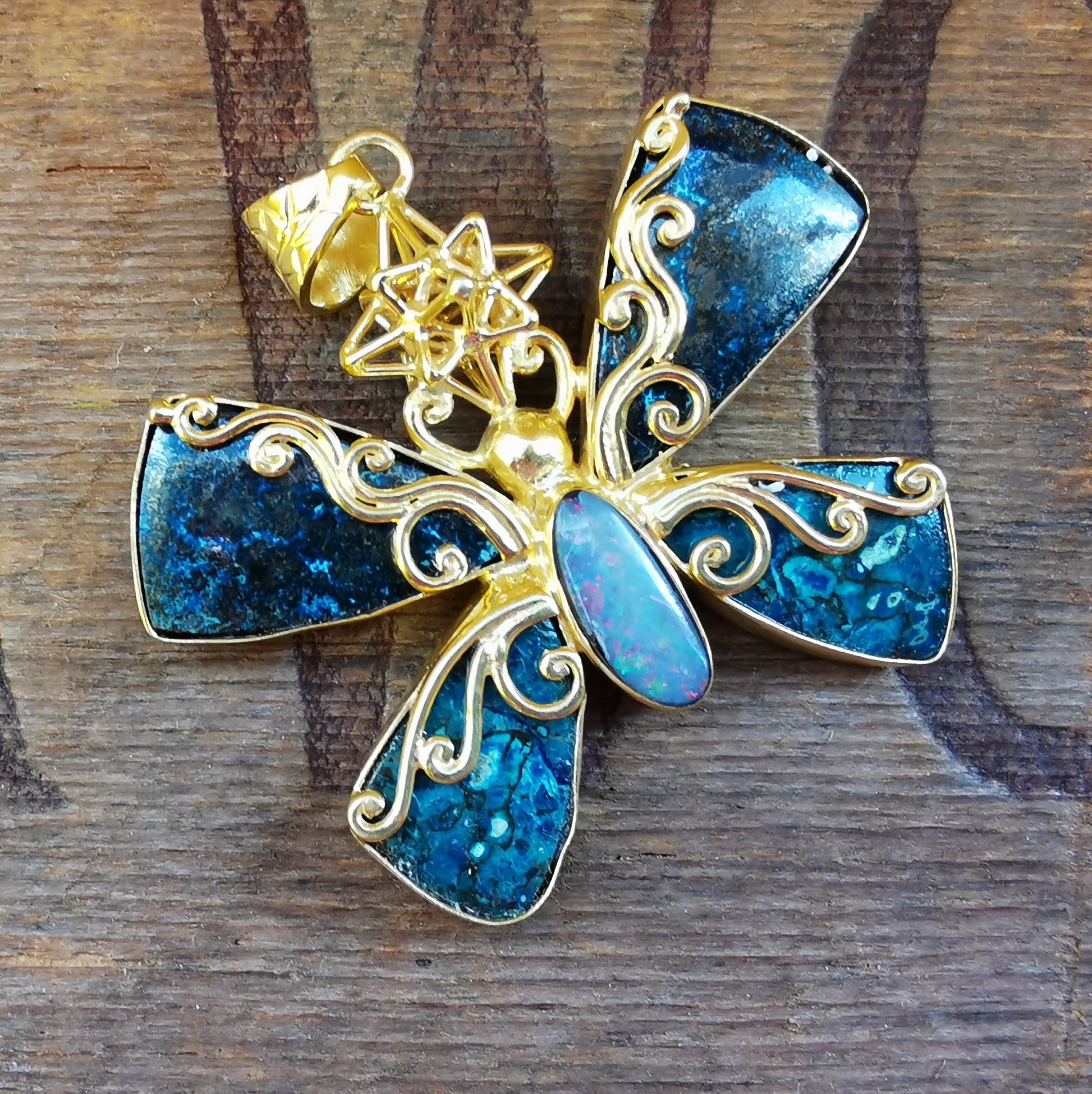 Ref.PD0899 - Gold plated on silver pendant with Heart Star geometry, azurite/malachite, and opal gemstones.