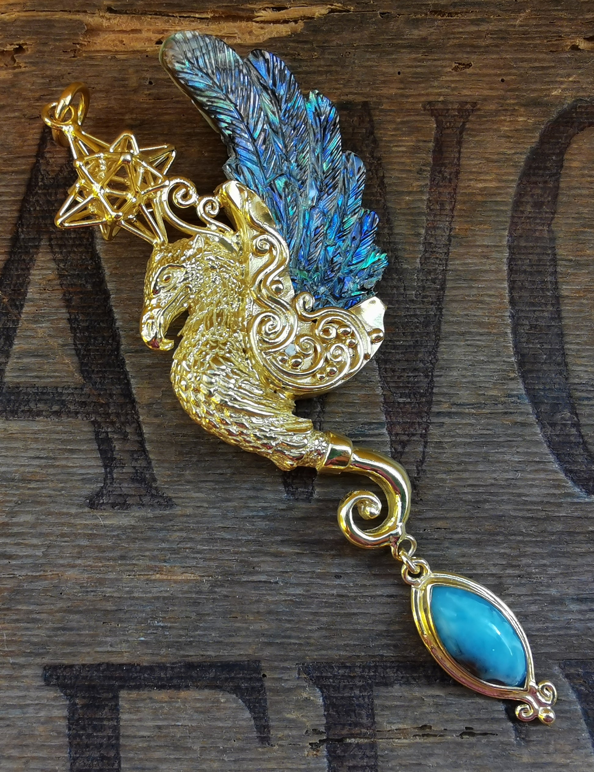 Ref.PD0902 - Gold plated on silver pendant with Heart Star geometry & dragon, abalone carved wings, and larimar gemstone.