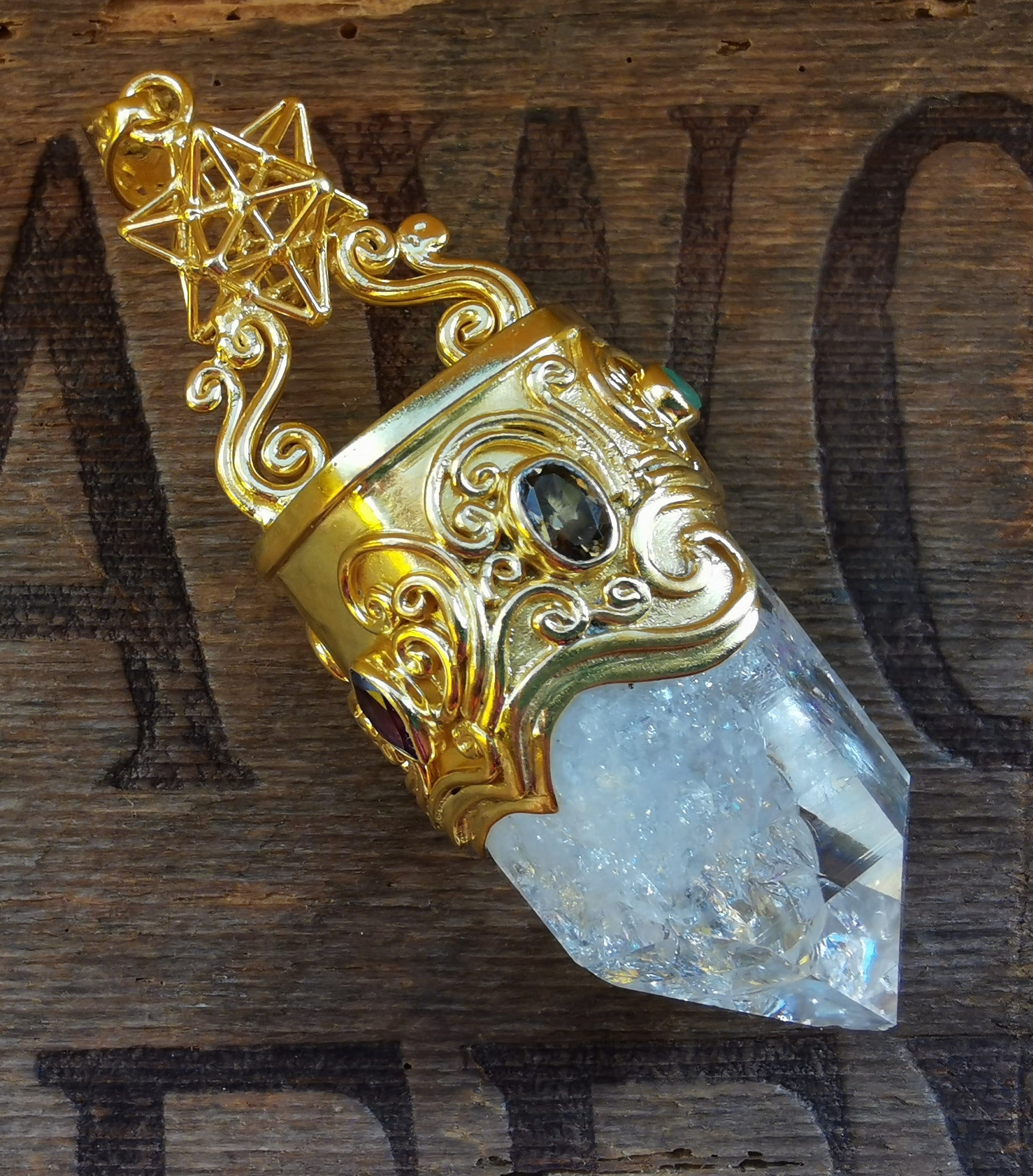 Ref.PD0903 - Gold plated on silver pendant with Solar Star geometry, quartz crystal, emerald, amethyst, and citrine gemstones.