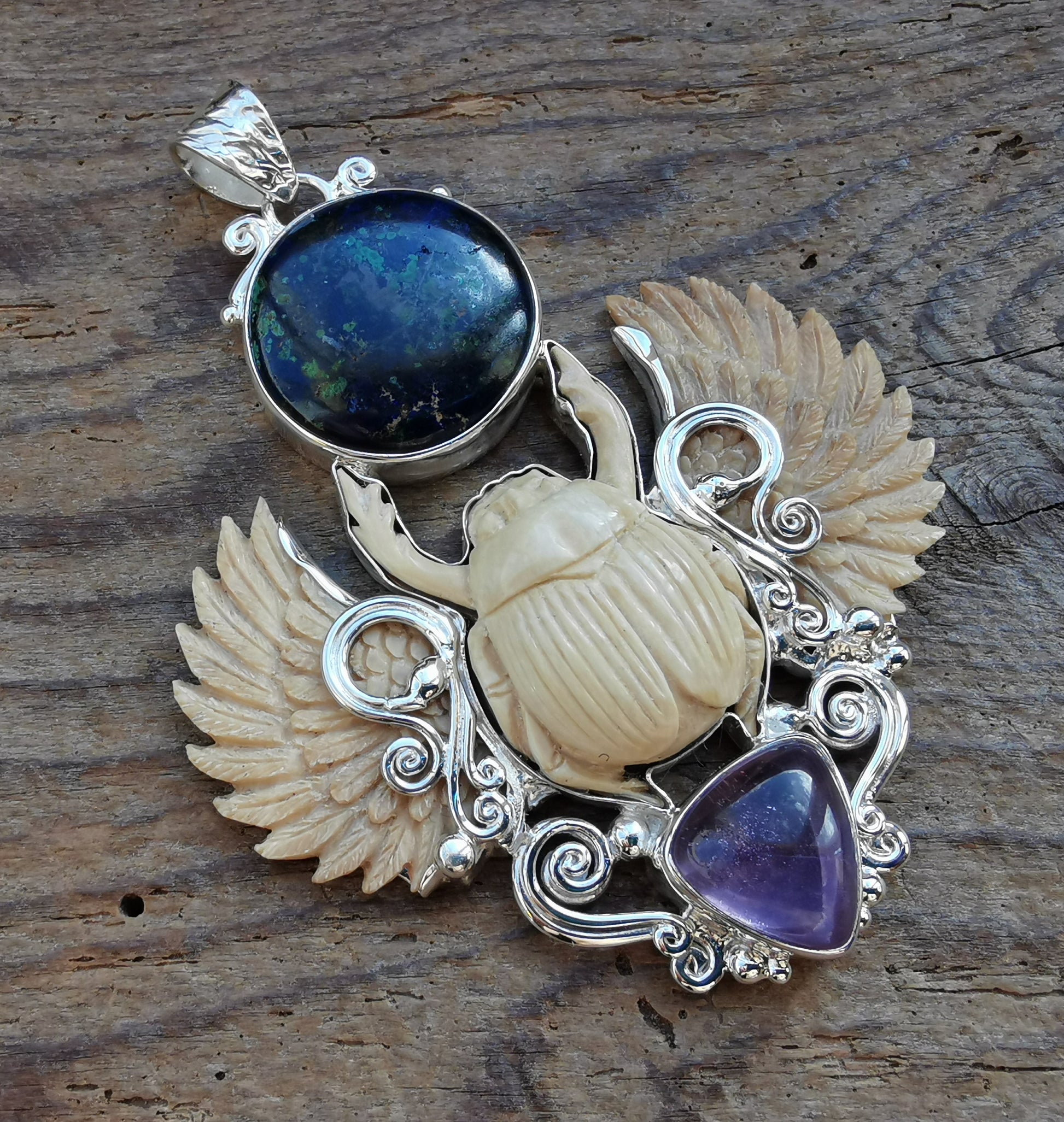 Ref.PD0905 - Silver pendant with scarab & wings carved in mammoth, azurite/malachite, and amethyst gemstones.