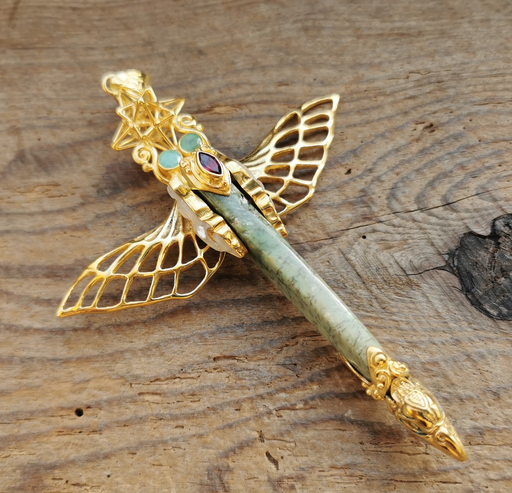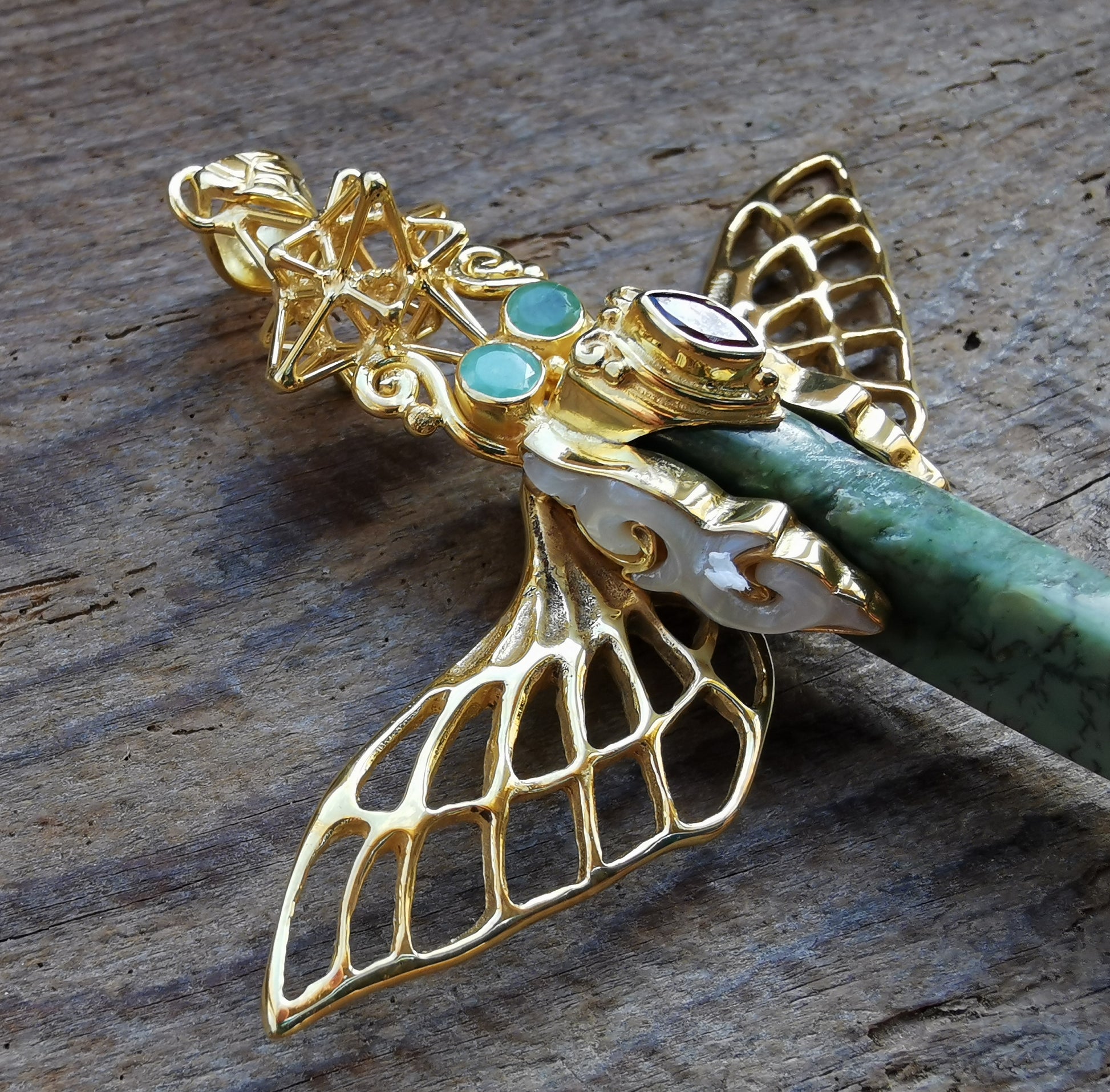 Ref.PD0907 - Gold plated on silver pendant depicting a dragonfly with Heart Star geometry & eagle head, mother of earl carved clouds, emerald, garnet, and green jasper gemstones.