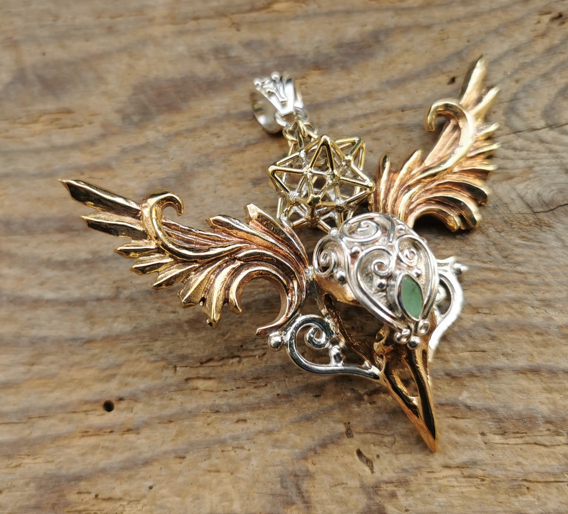 Ref.PD0917 - Brass/silver raven skull pendant with Solar Star geometry, and jade gemstone.