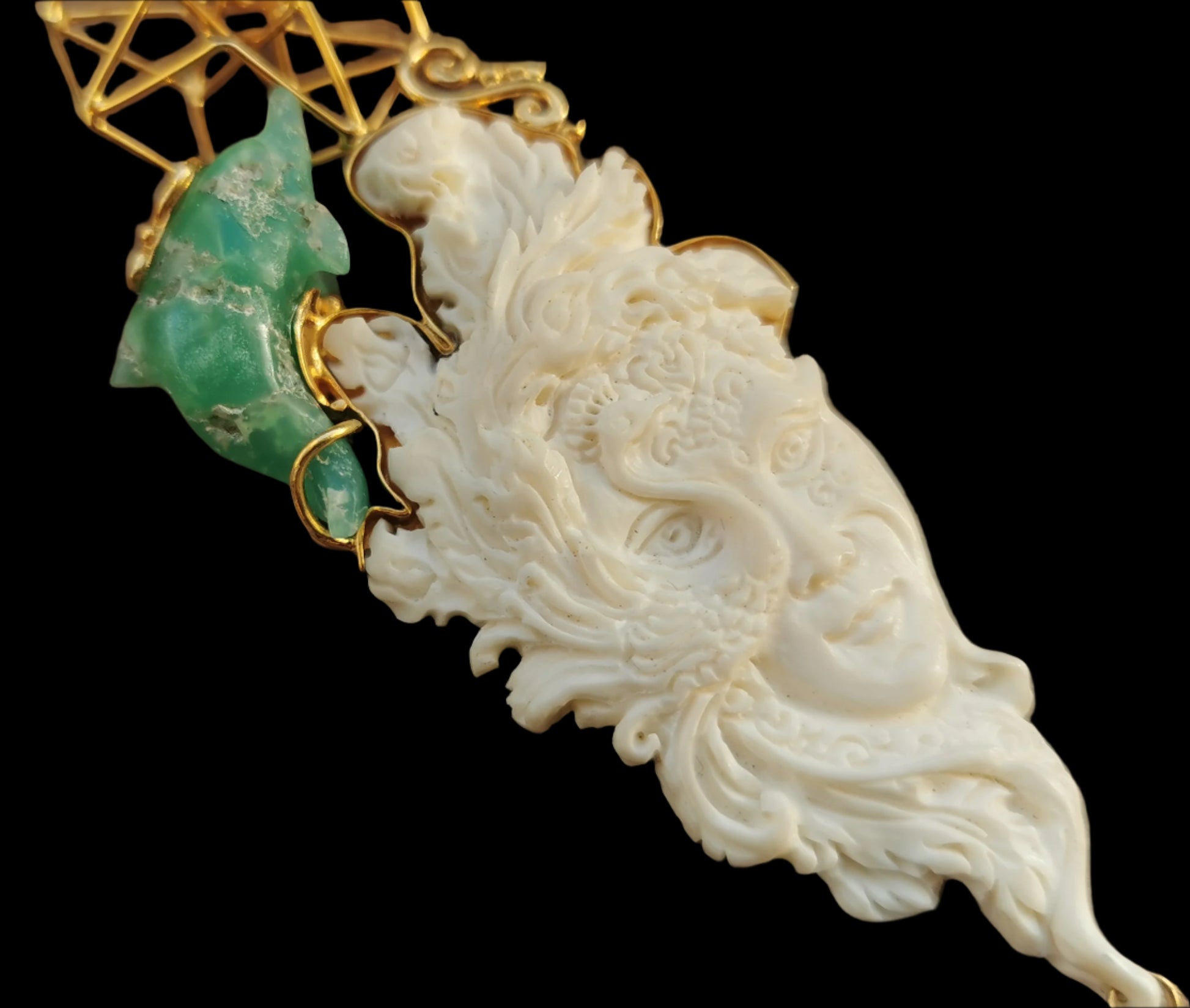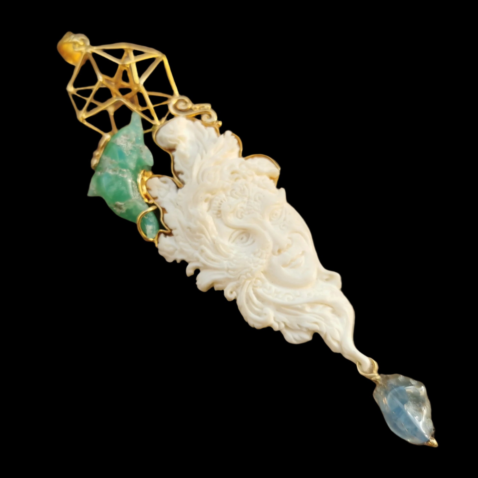 Ref.PD0919 - Gold plated on silver pendant with Hyper Cube geometry, mammoth carved fairy, chrysoprase carved dolphin, and opal gemstone.