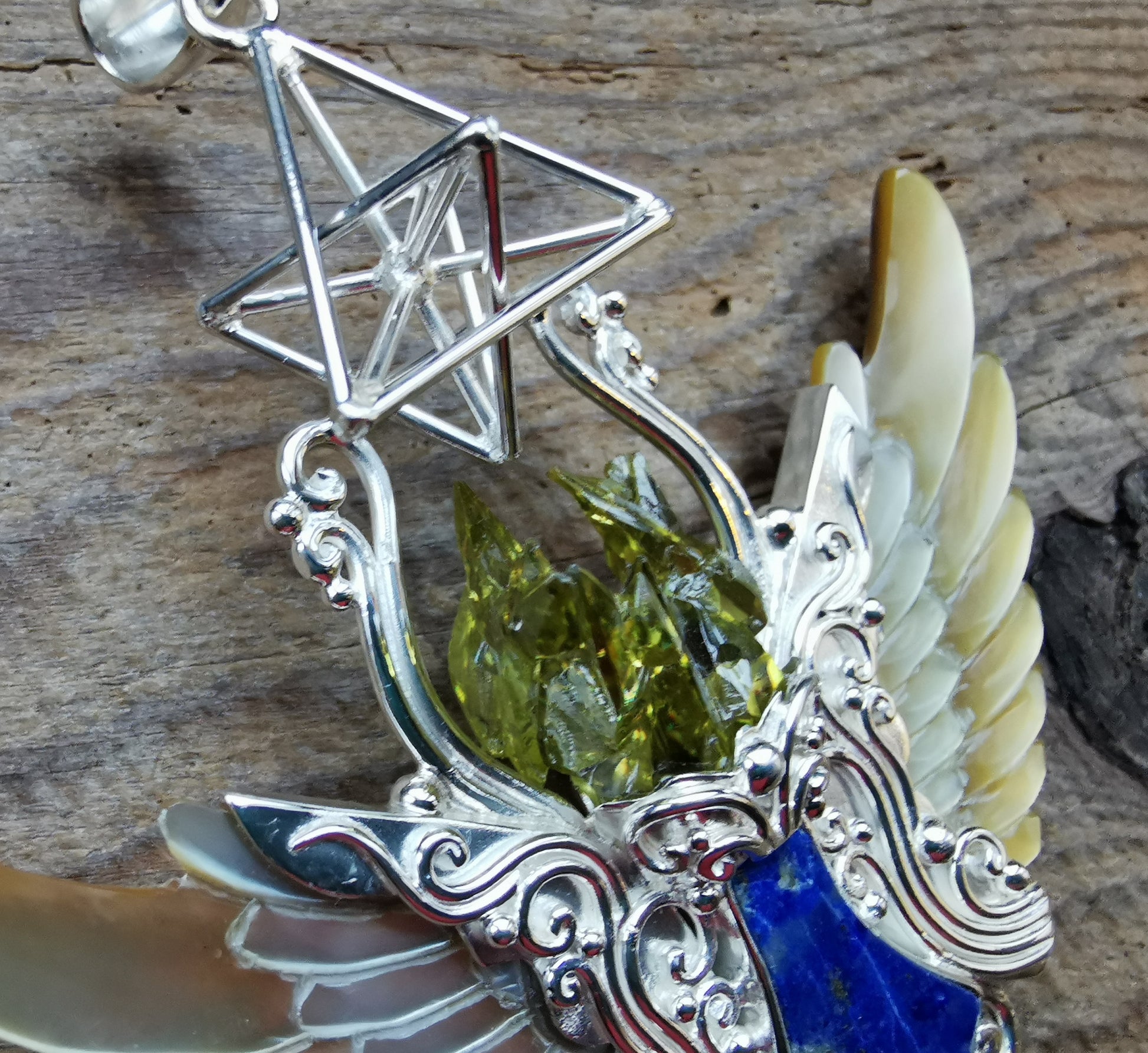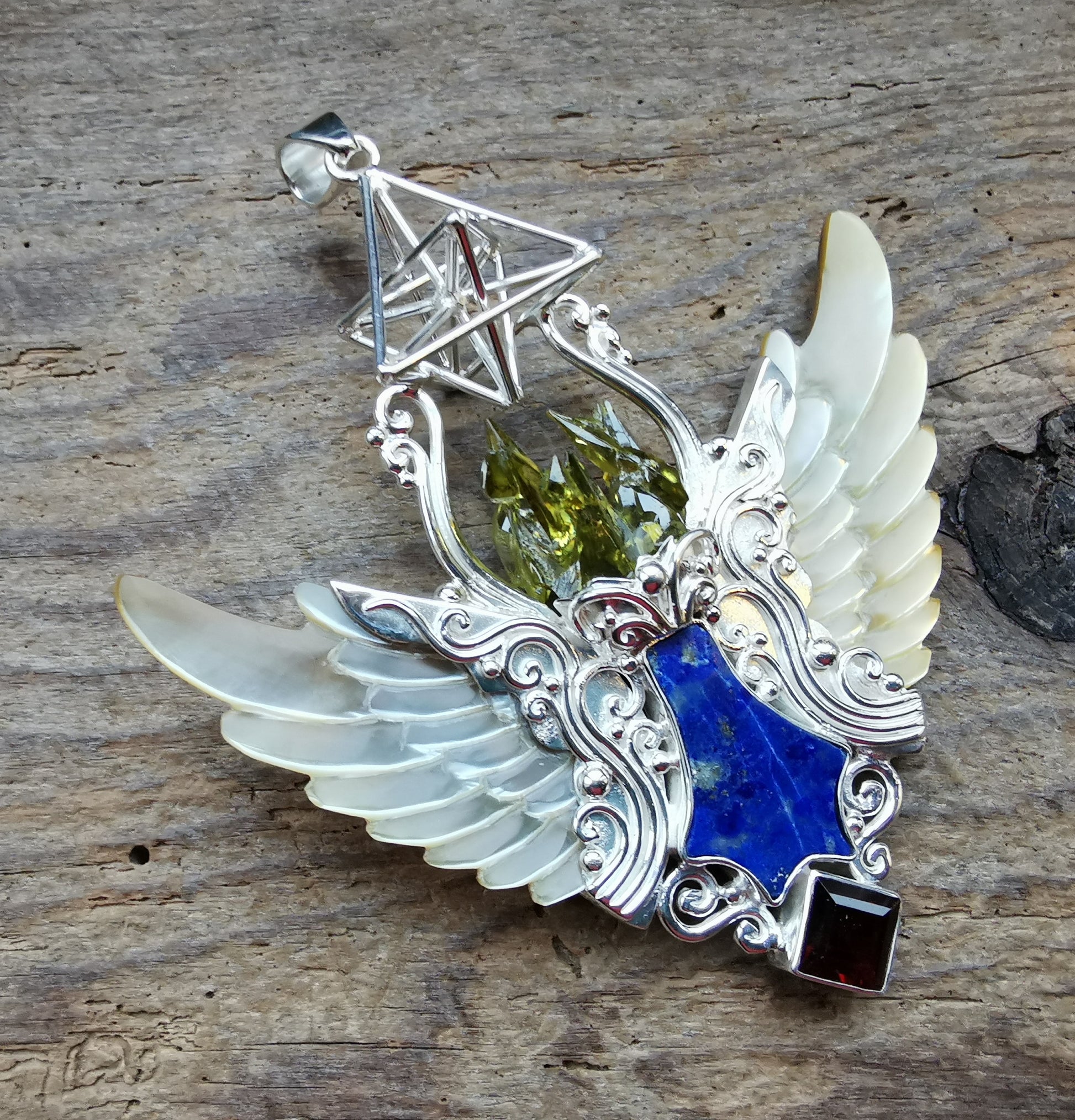 Ref.PD0922 - Silver pendant with Hyper Tetrahedron geometry, mother of pearl carved wings, zincite, lapis lazuli, and garnet gemstones.