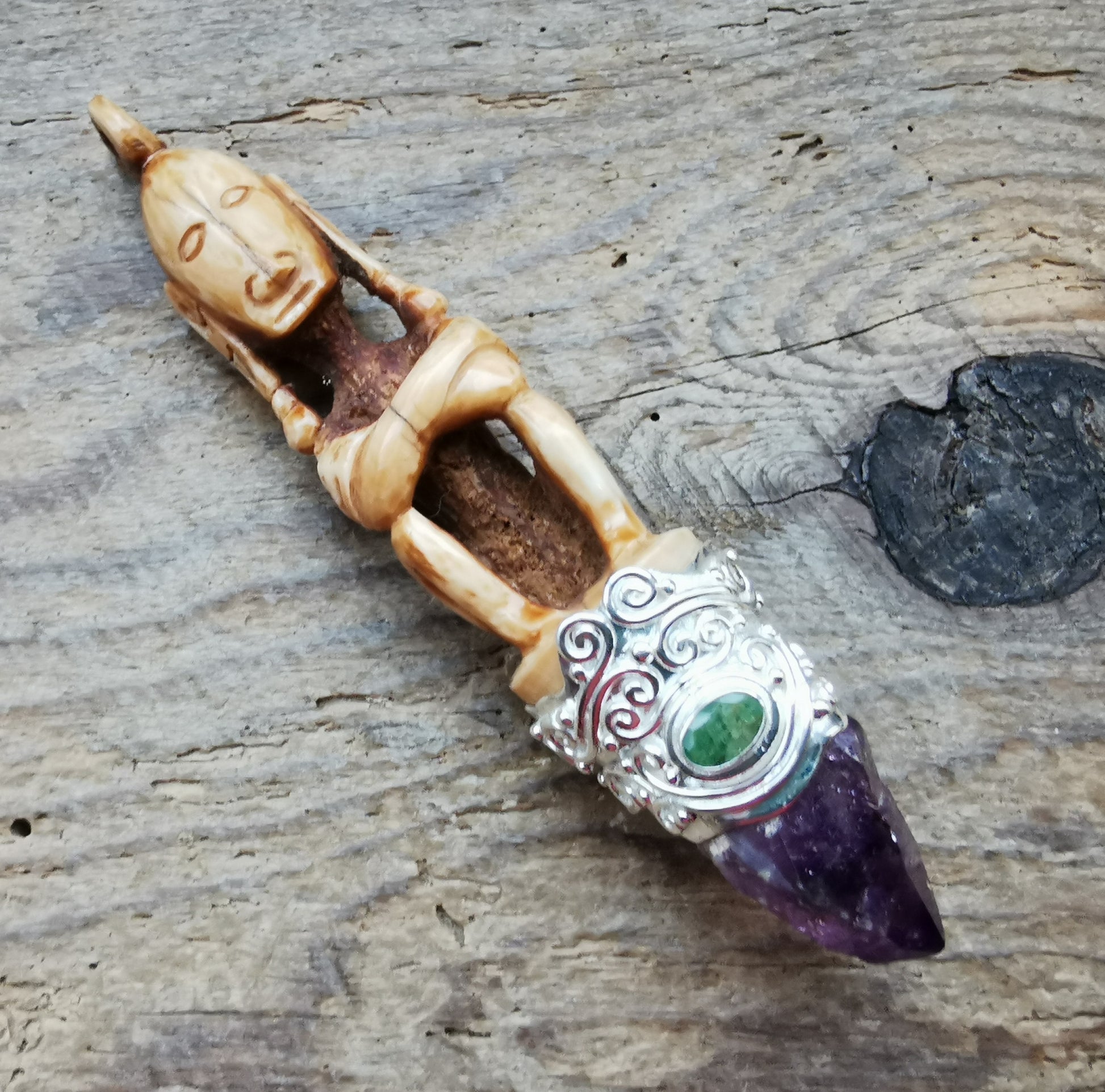 Ref.PD0925 - Silver pendant with 60+ years deer horn carved ancestor (from Timor), Brandberg amethyst, and emerald gemstones.
