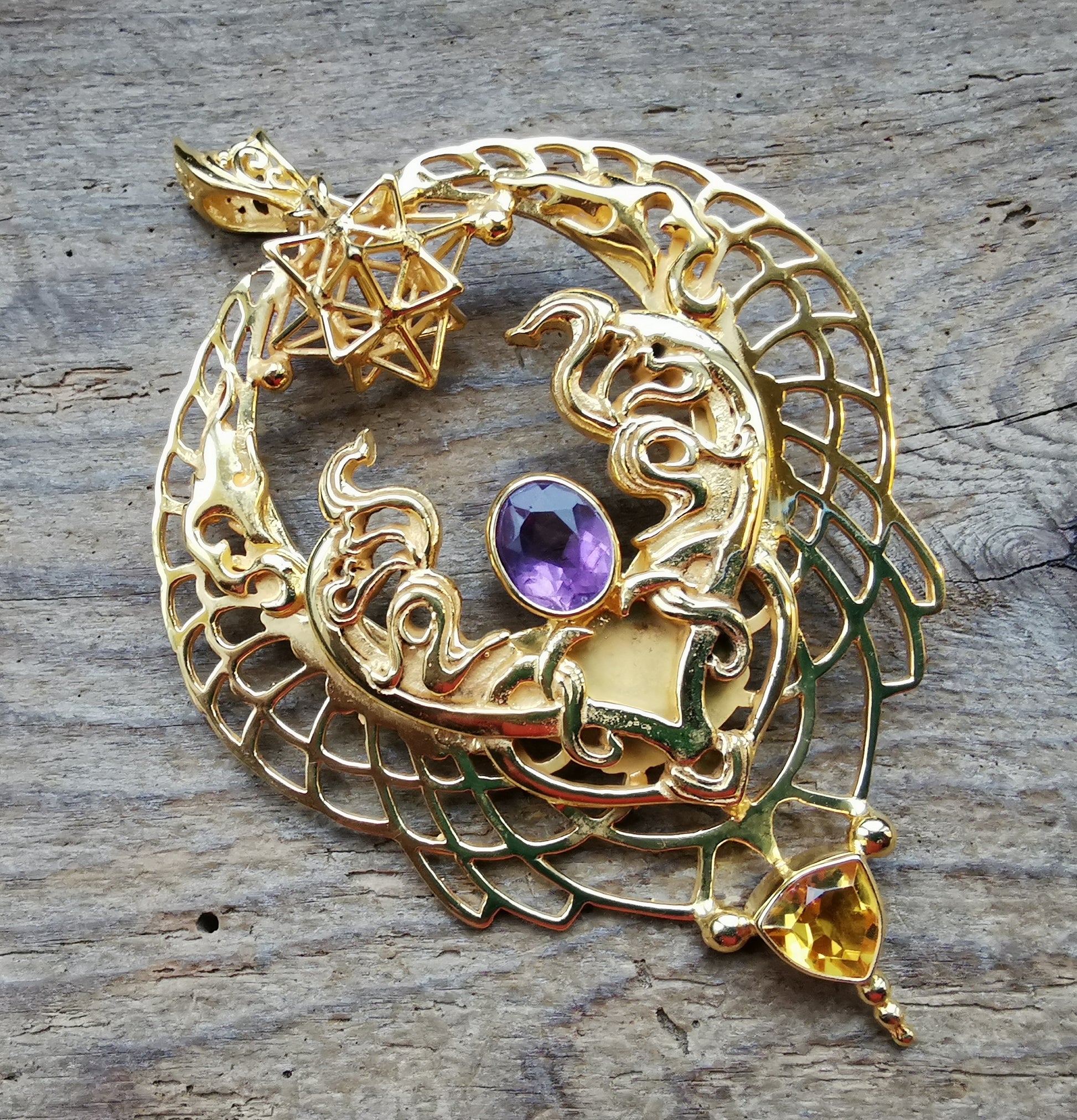 Ref.PD0931 - Gold plated on silver pendant with Heart Star geometry, amethyst, and citrine gemstones. Art Nouveaux style.