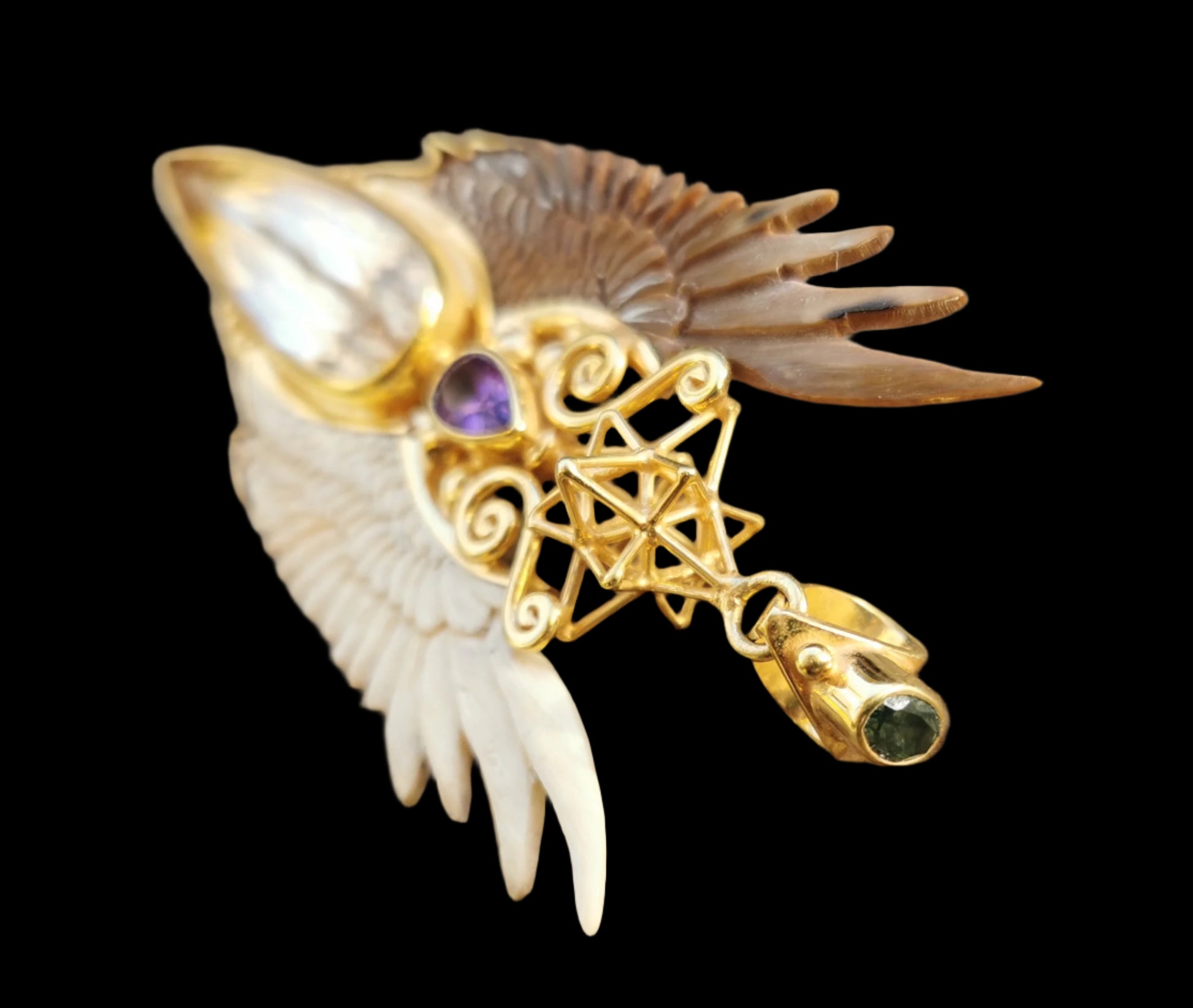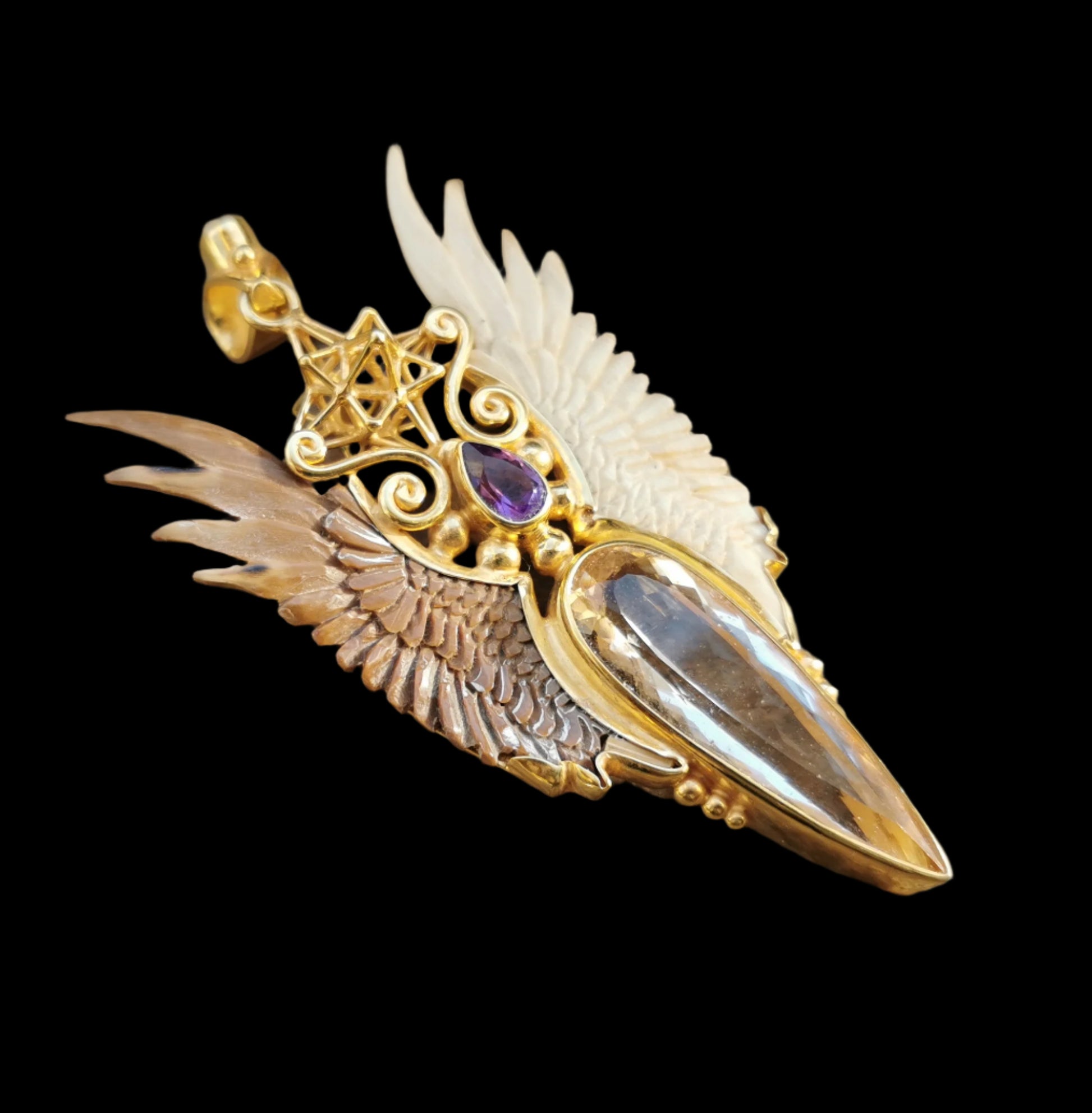 Ref.PD0934 - Gold plated on silver pendant with Heart Star geometry, mammoth carved wings, peridot (bale), amethyst, and ametrine gemstones.