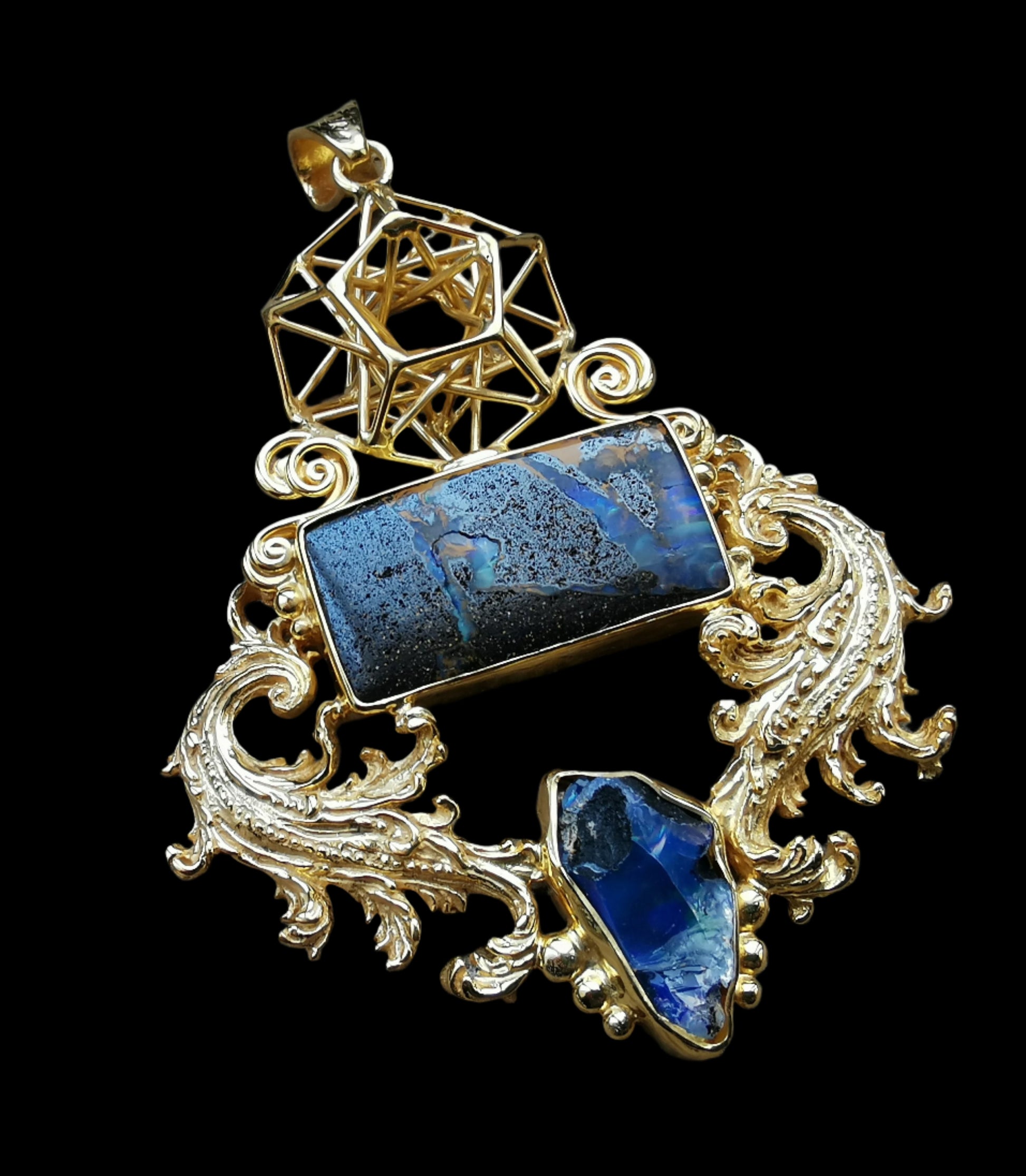 Ref.PD0936 - Gold plated on silver pendant with 5D Hyper Dodecahedron geometry, and opal gemstones.