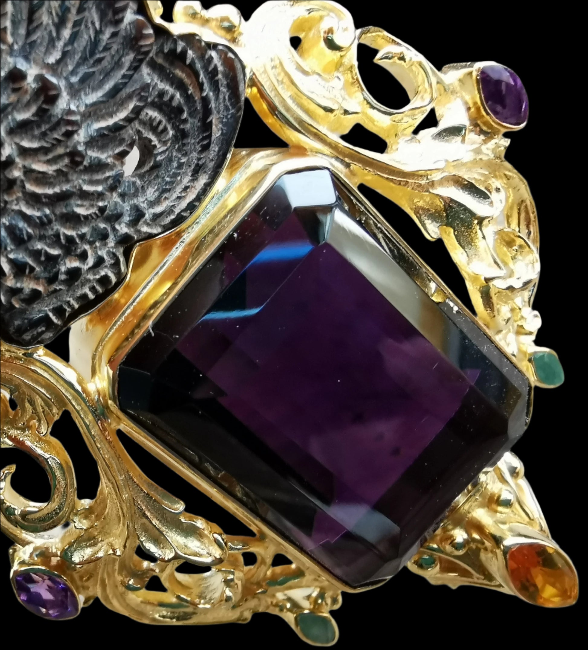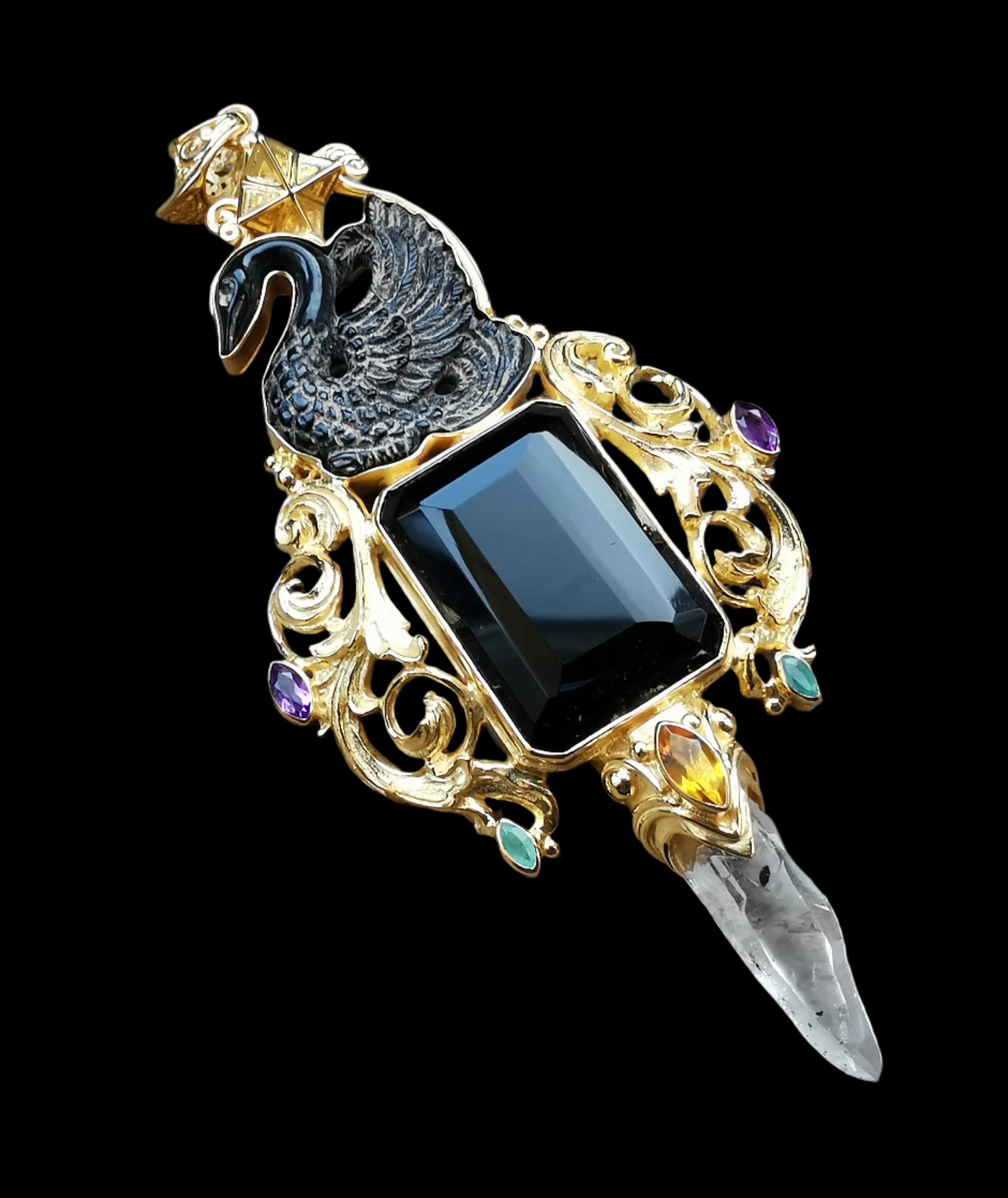 Ref.PD0937 - Golden plated on silver pendant with solid Tantric Star geometry, ecologically sourced buffalo horn carved swan, laser quartz crystal, amethysts, emeralds, and citrine gemstones.