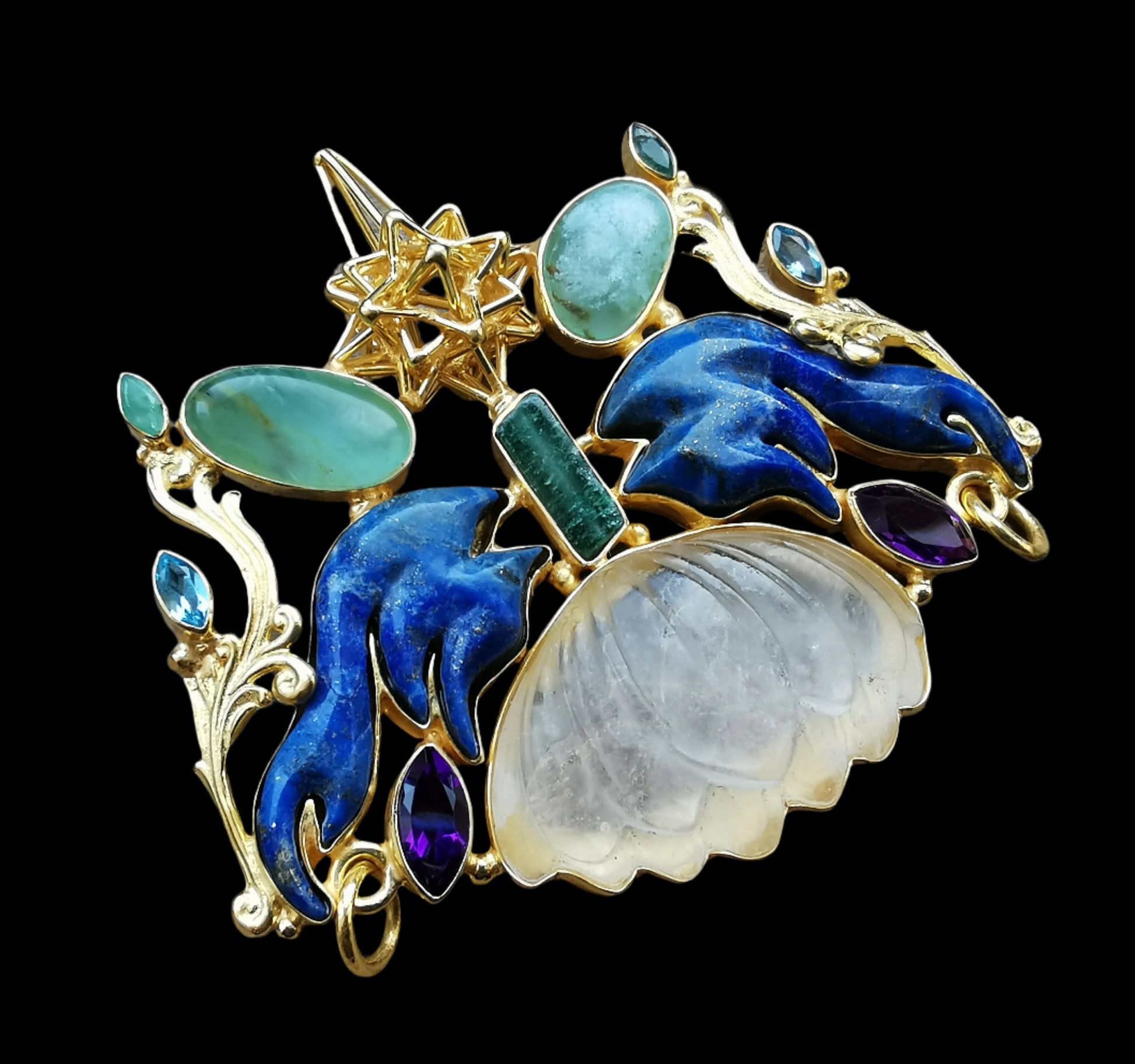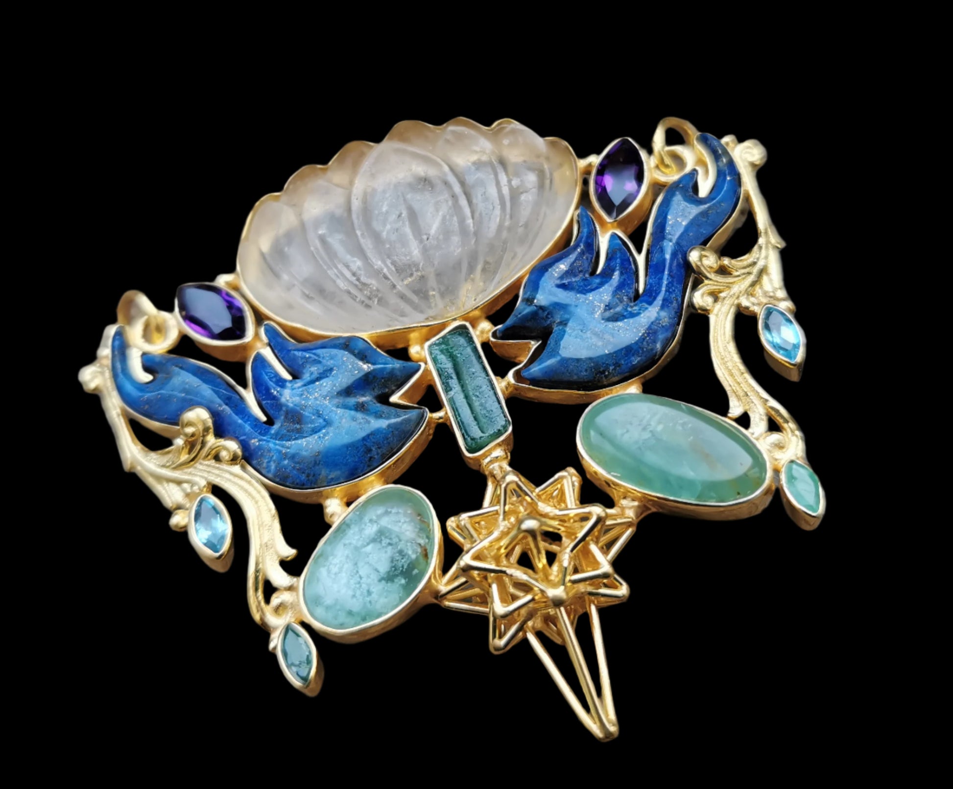 Ref.PD0941 - Gold plated on silver pendant with shooting star motif, quartz crystal carved lotus flower, lapis lazuli, emerald, sky blue topaz, Andean opal, aquamarine, and amethyst gemstones.