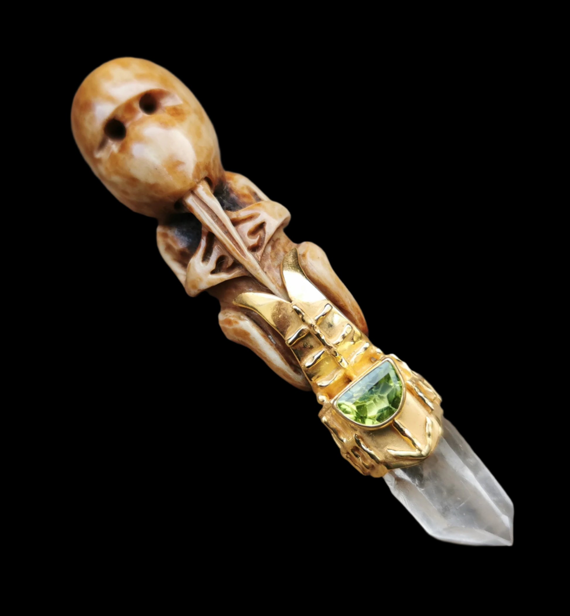 Ref.PD0942 - Gold plated on silver pendant with 60+ years deer horn carved ancestor (from Timor), laser quartz crystal, and peridot gemstone.